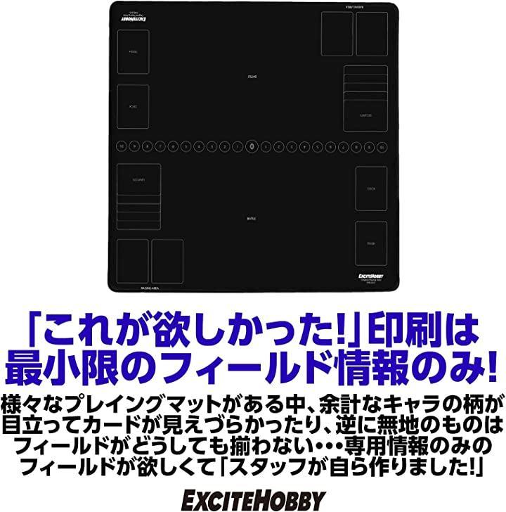 ・「黒無地の表面にバトルフィールドのみを印刷。」 スタッフの「派手なデザインはちょっと恥ずかしい」「シンプルなデザインのかっこいいマットほしいですね」と言う言葉から生まれたプレイングマットです。