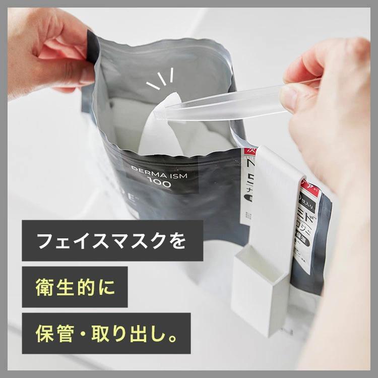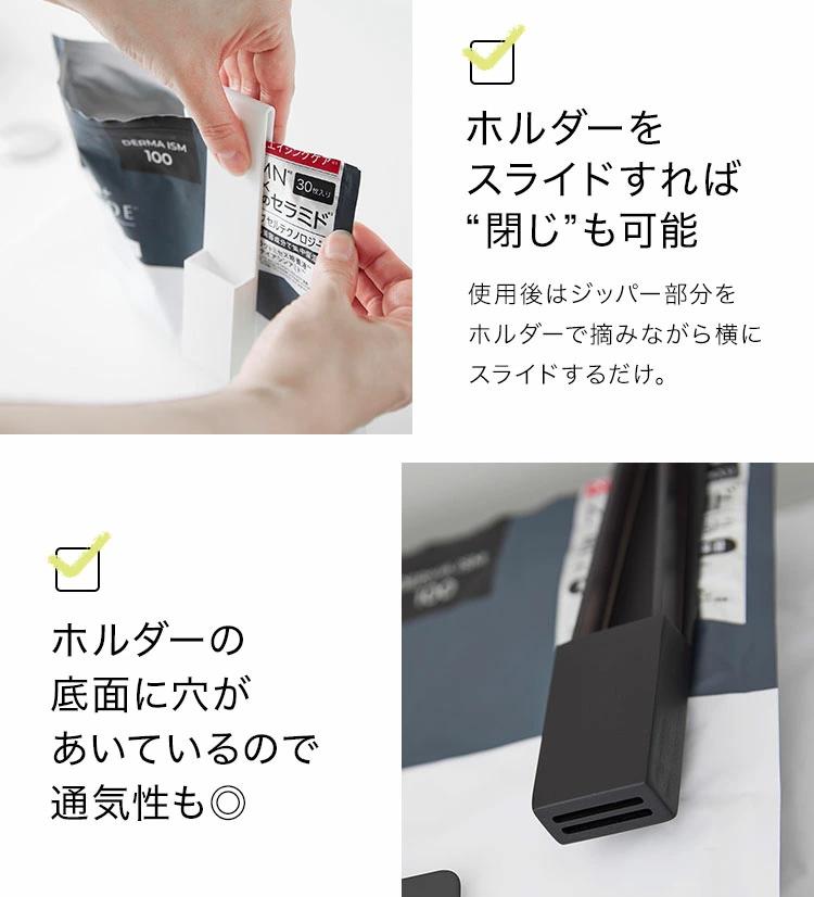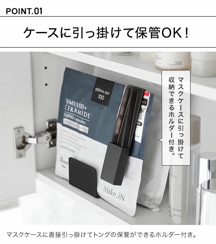 【ホルダー付きフェイスマスクトング】フェイスマスクを衛生的に取り出すことができるホルダー付きトング。フェイスマスクを清潔に保存することができます。使用後はジッパー部分をホルダーで摘みながら横にスライドするだけ。トングは先端が浮いた状態で置くことができ、ホルダーの底面には穴があいているので通気性も良く衛生的に使うことができます。