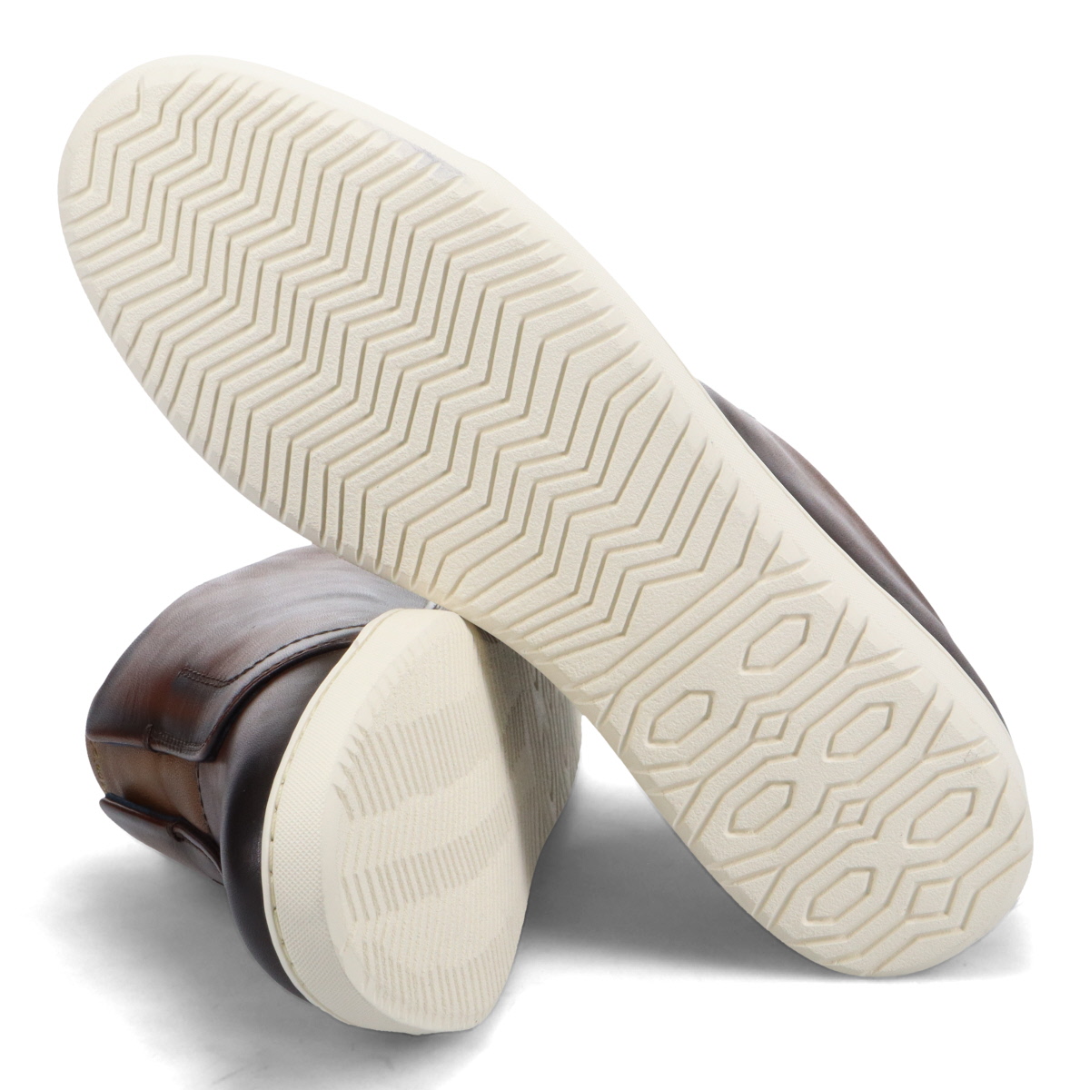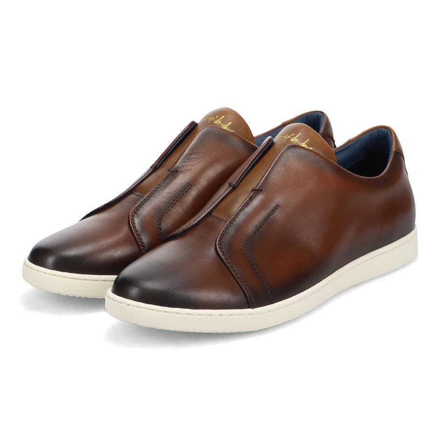 | フェイククォータースリッポンスニーカー 【素材】 ソフトなクラストレザーに陰影加工を施したカウレザーを使用。 ※本革を使用していますので多少のムラ・小傷がございます。 【デザイン】 羽根と呼ばれるパーツをデザインし、内側に隠されたエラステックバンドでスポッと履けるスニーカー。 アッパー素材の高級感と着脱のしやすさを兼ね備えた、ハイクォリティースニーカーです。 ライニングには高機能マイクロファイバーを使用し吸汗性能・防臭のパフォーマンスに優れています。 【サイズ】 普段革靴で25.5cm、ライニングやインソールにクッションが入っているスポーツ系スニーカーで26.5cm〜27.0cmを使用するスタッフで<41/25.5cm>がちょうどよかったです。 ※サイズ感は、個人差がございますのであくまで参考程度にお考え下さい。 ■ブランド:whoop'-de-doo' destruction ■カラー:キャメル、グレー、ワイン ■アッパー素材:牛革 ■底材:合成ラバー ■ソール:約1.5cm ■ヒール:約2.3cm ■重さ(片足)約:350g ■製法:オパンケ製法 ■中国製 *上記は全て25.5cmで計測した数値です。 *多少の誤差が生じる場合がございますので予めご了承下さい。 whoop de doo co.,ltd whoop'-de-doo' フープディドゥ |