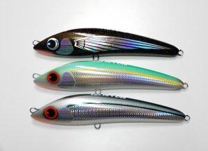 ジャークダイブペンシルシリーズ。JD-P225のサイズアップモデル。GT、ヒラマサ関連用ルアープラグでございます。まあ大型ルアーですので日本ではちょっとなサイズ感ですが。TBOがポップから入るペンシルにして、JD-Pはミノーに近いウォブル系のダイビングペンシルです。GTやマグロ系に使用しておりますが、シイラベイトのヒラマサにも有効なルアーです。波動を重視した扁平形状から安定したスイムアクションが得られます。TBOが水音と共に潜っていくペンシルならこれは静かに控えめな音で潜るルアーとなります。