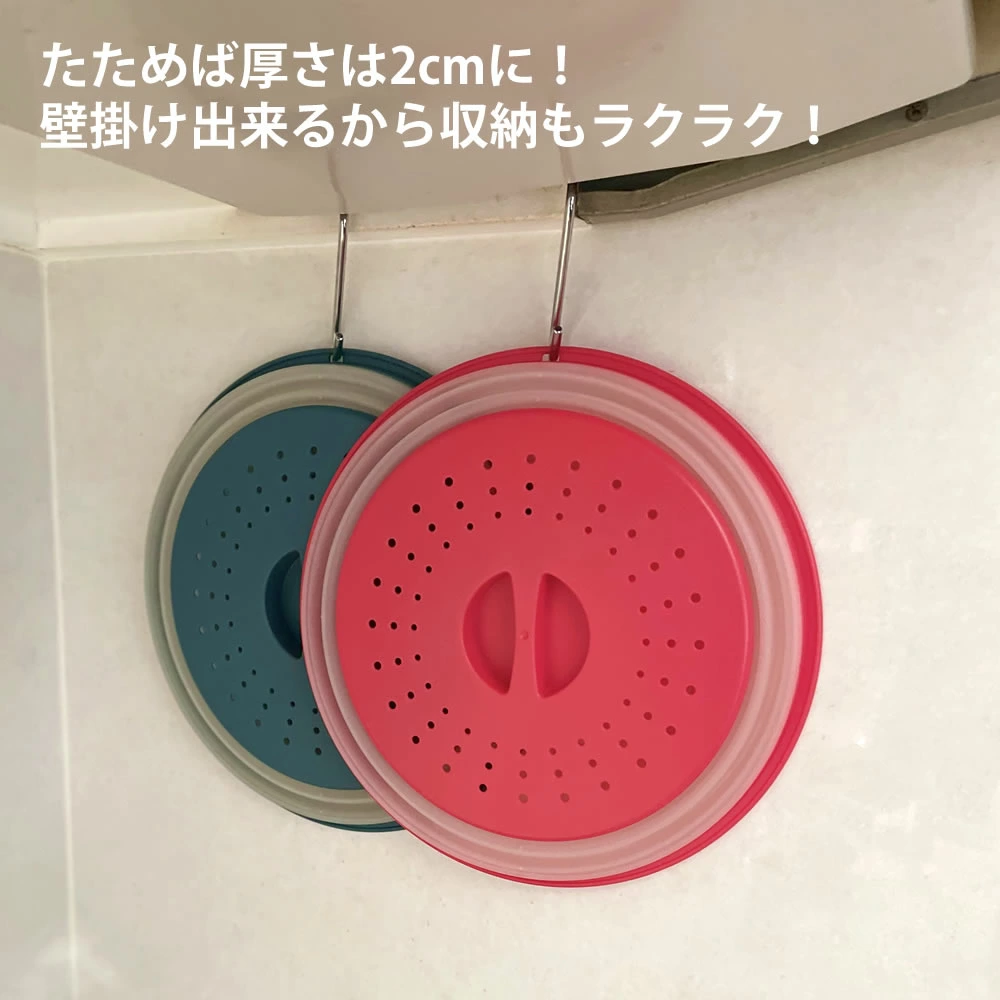 【商品情報】レンジカバー&ザルの2wayツールたためば厚さは2cmに!壁掛け出来るから収納もラクラク!食洗機対応フードカバーとしてもご利用いただけます