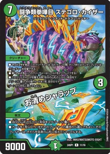 ■搭載パック:DM24-SP1キャラプレミアムデッキ「ドラゴン娘になりたくないっ!イェーイめっちゃドラゴン!!」■収録:構築済みデッキ■■レアリティ:レア■種類:クリーチャー■文明:自然■種族:ジュラシック・コマンド・ドラゴン/ハンター■コスト:7■パワー:9000■マナ:1■■シリーズ:DM24SP■シリーズ■効果テキスト:■マッハファイター(このクリーチャーは、出たターンの間、タップまたはアンタップしているクリーチャーを攻撃できる)■W・ブレイカー(このクリーチャーはシールドを2つブレイクする)■このクリーチャーが攻撃する時、自分の山札の上から1枚目をマナゾーンに置く。その後、カードを1枚、自分のマナゾーンから手札に戻してもよい。■フレーバー:【呪文】自然(3)■自分の山札の上から1枚目をマナゾーンに置く。■カードを1枚以上、いずれかのプレイヤーの墓地から選んでもよい。そのプレイヤーは、それらを自身の山札に加えてシャッフルする。