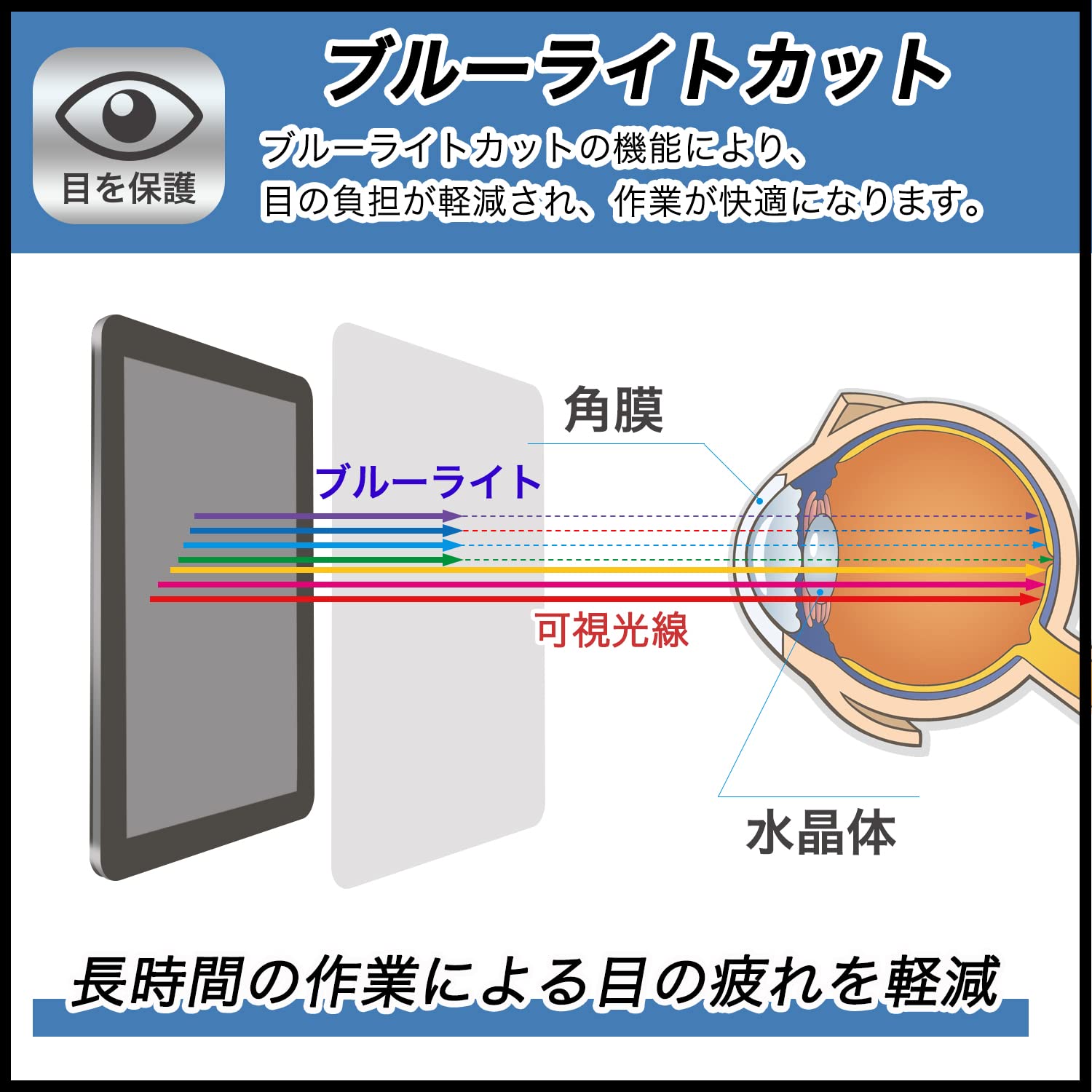 【商品説明】1:表面硬度が9Hと非常に強いので、画面を摩損、傷、落下などの破損、衝突から守ります。2:高透過率(透過率92%)3:ブルーライトカット率:48% 紫外線カット率:99%。長時間の作業による目の疲れを軽減。4:ハードコート加工により、フィルム表面に擦り傷や傷がつくのを防ぎます。5:指紋や汚れがつきにくく簡単にふき取ることができます。ホコリも付着しにくい帯電防止仕様。