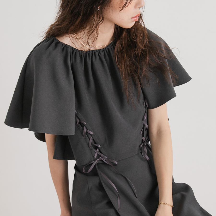 オフショルとしても着用可能なフレアスリーブレースアップトップス