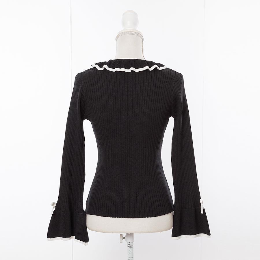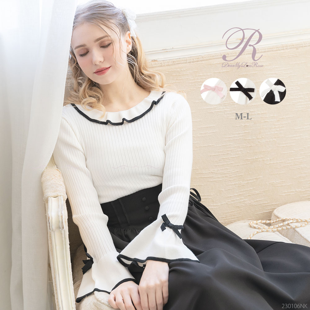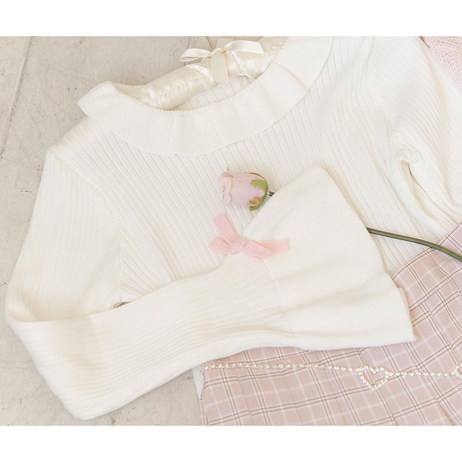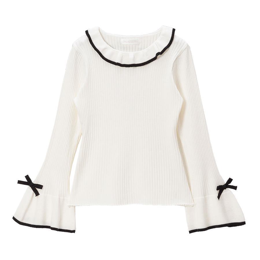 フレアスリーブとフリル襟が【デザイン】手元を動かすたびに揺れるフレアスリーブはどこか上品な印象にしてくれ、思わず目を惹かれるデザインです。手首に付いた配色リボンやお顔周りを華やかに彩るフリル襟など、甘めなディティールが可愛いポイント◎首回りは程よく開いており、被りで簡単に着用いただけます。リブ部分は綺麗に体にフィットしてくれて、スタイルもすっきり見えるように!ホワイト×ブラックとブラックは襟先と袖口が配色になっており、ピンクはシンプルな単色ホワイトなので、お好みのデザインをお選びください♪