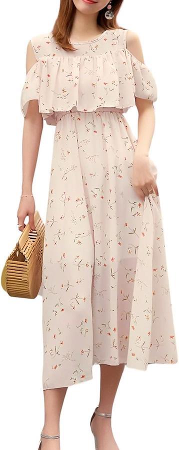 「涼しげなオフショル&フリル」 肩を綺麗に見せるオフショルデザインに、胸元のフリルが華やかさをプラス。