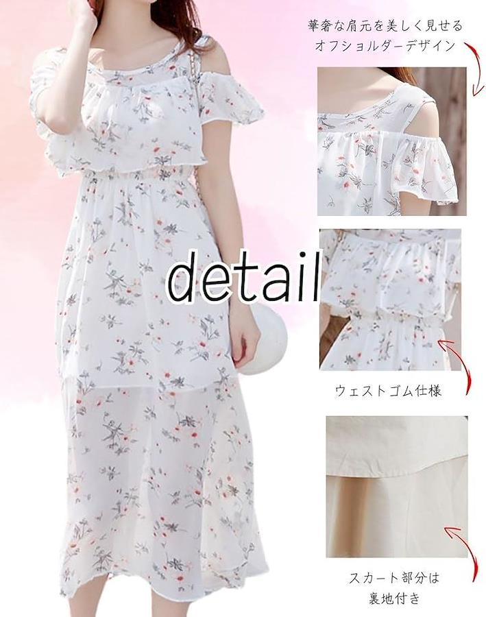 華奢な肩元を美しく見せるオフショルダーデザインと、ふんわりフレアなAラインシルエットが魅力のロングワンピース。