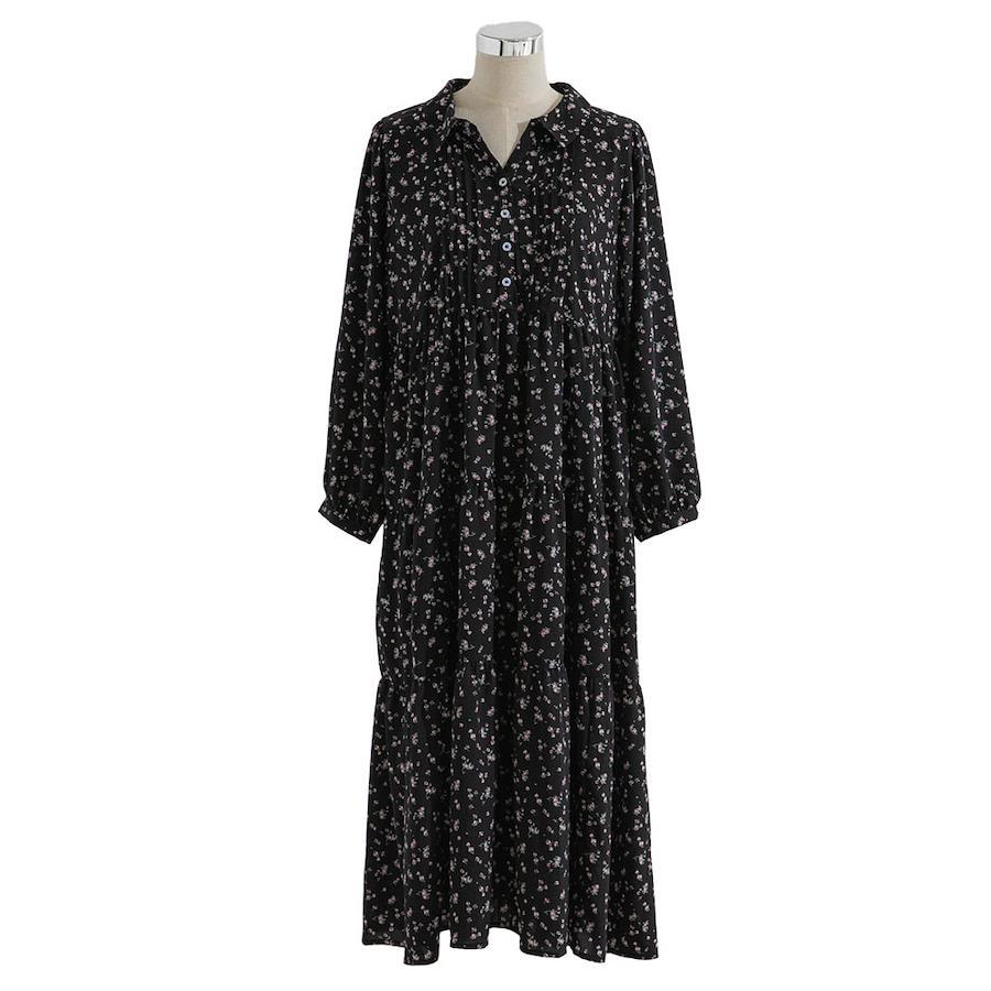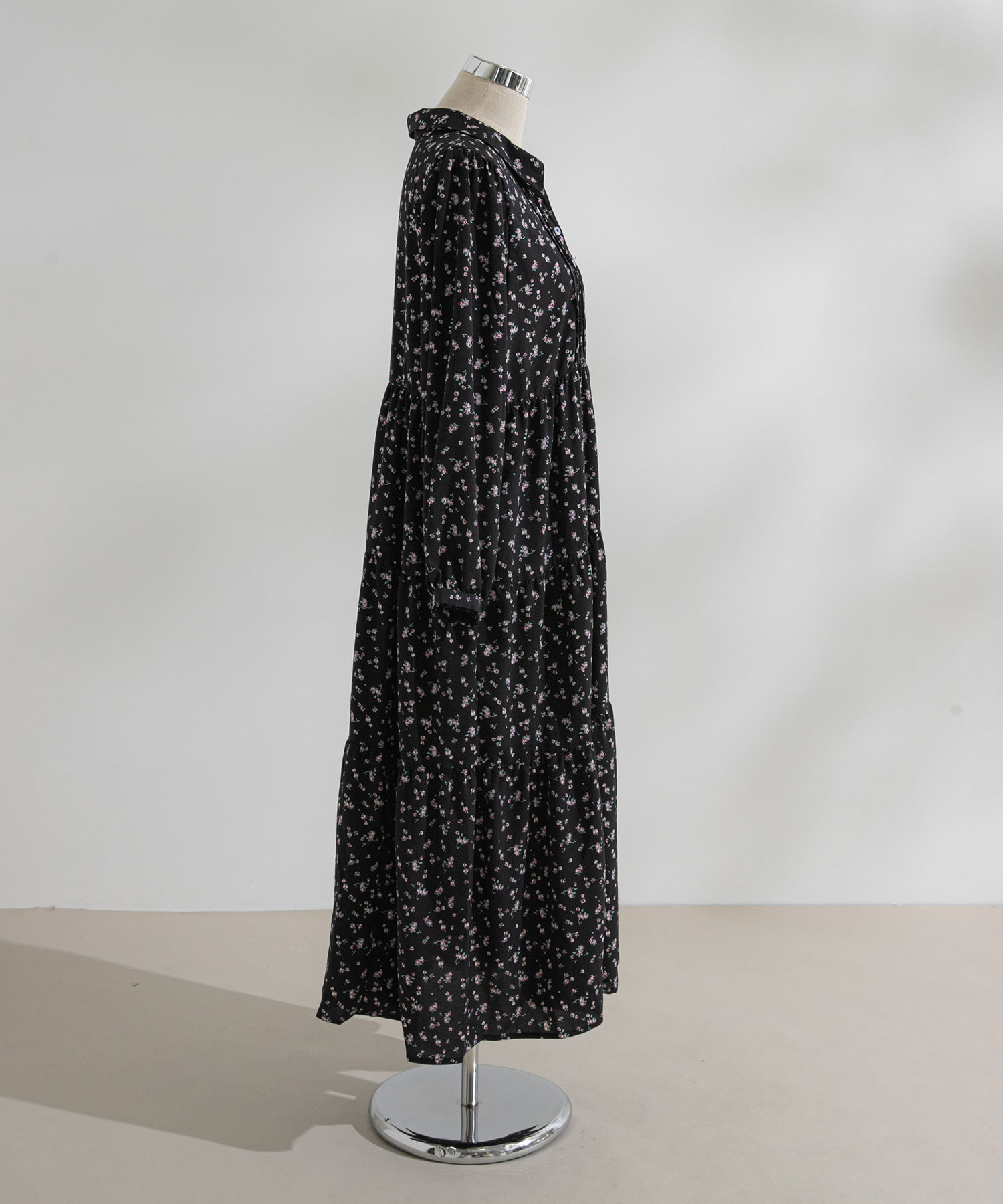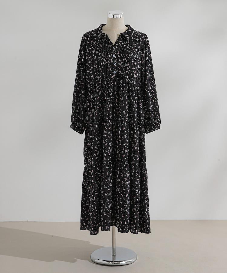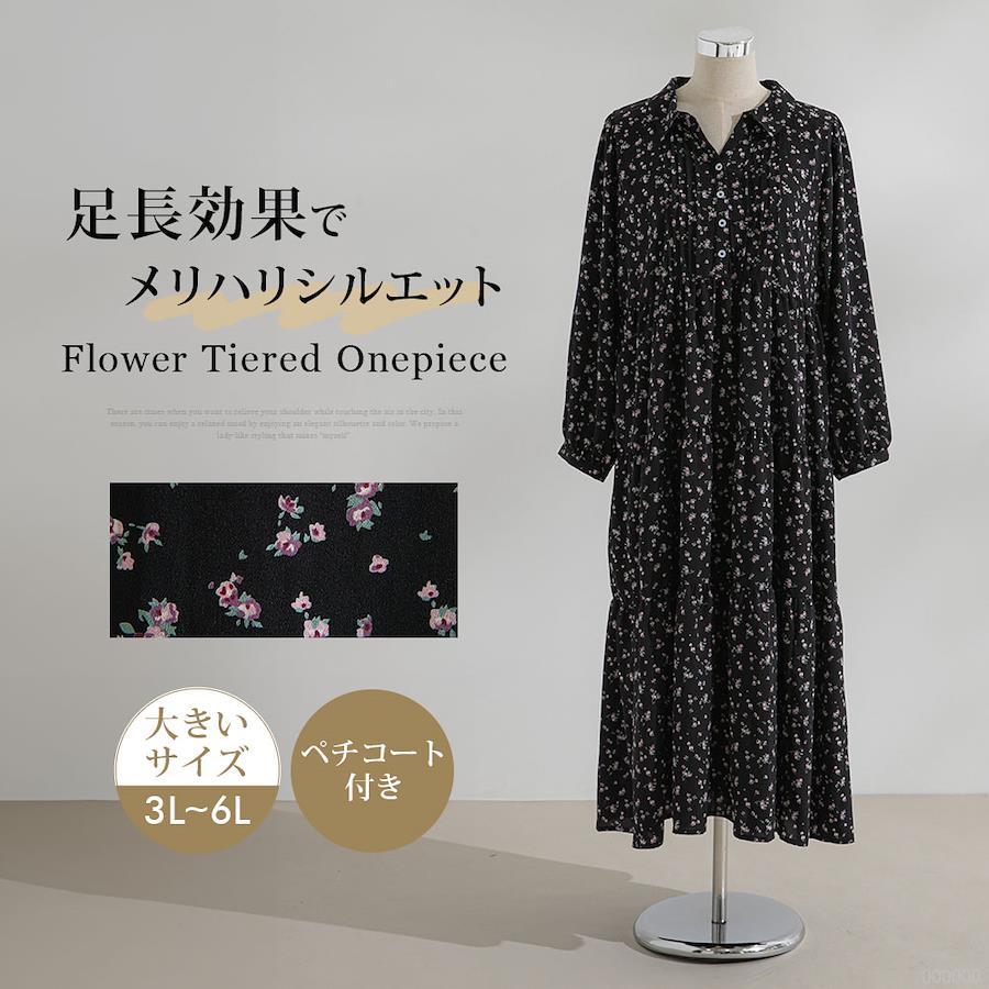 【ディティール】ティアード部分は、広がり過ぎず落ち感の良い素材でスッキリ見せ!首を長く見えるようにV字に開く衿ぐりがポイント◎前身頃には、ピンタックを入れて広く見えるのを解消したデザインに。少し高めのウエスト切り替えで、足長効果も抜群!メリハリシルエットが叶う1着です。スカート部分は透け防止のペチコート付きなので安心。