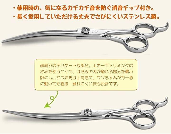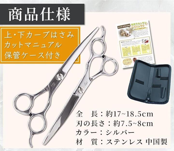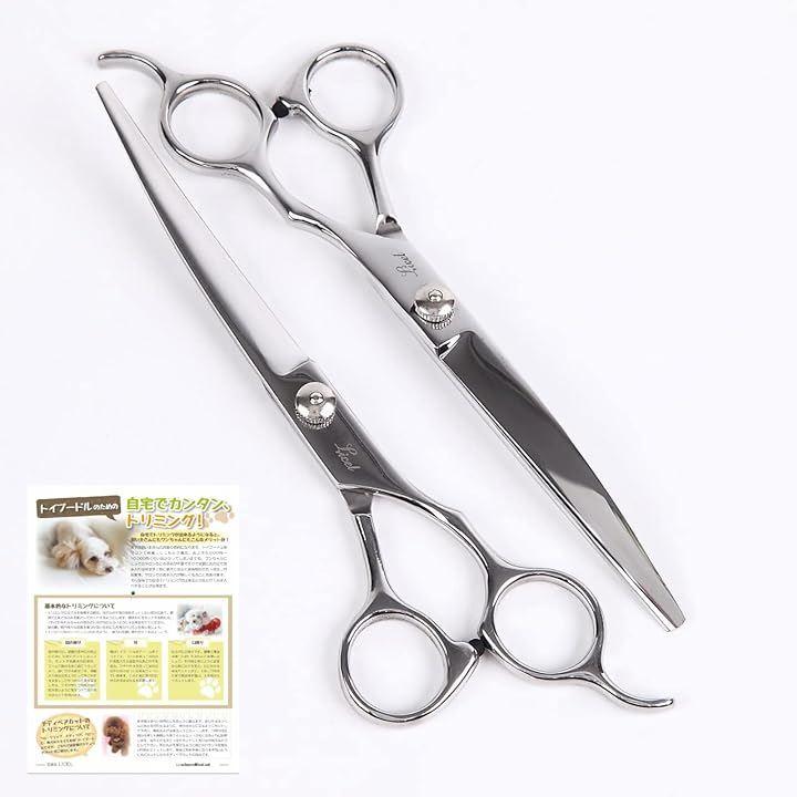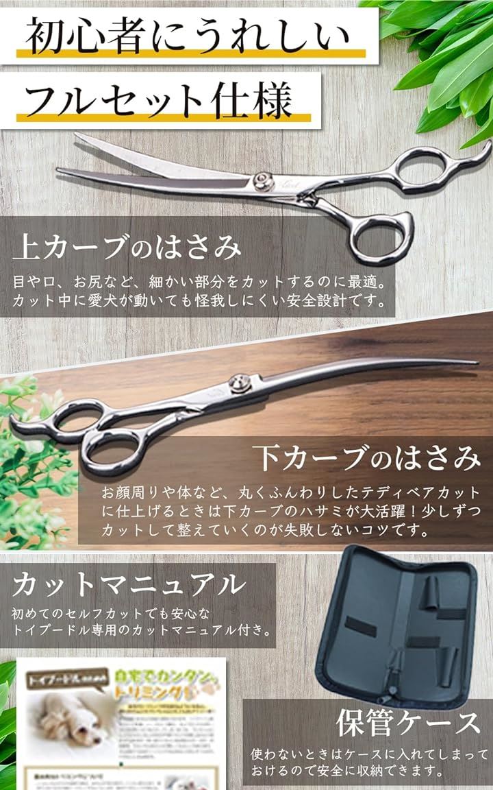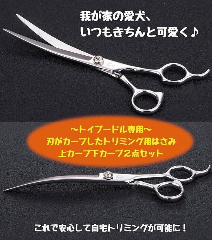 目や口、お尻など細かいところをカットするのに最適な上カーブのはさみと、お顔周りや体など丸くふんわりしたテディベアカットに仕上げるときに活躍する下カーブのはさみの2本セット。