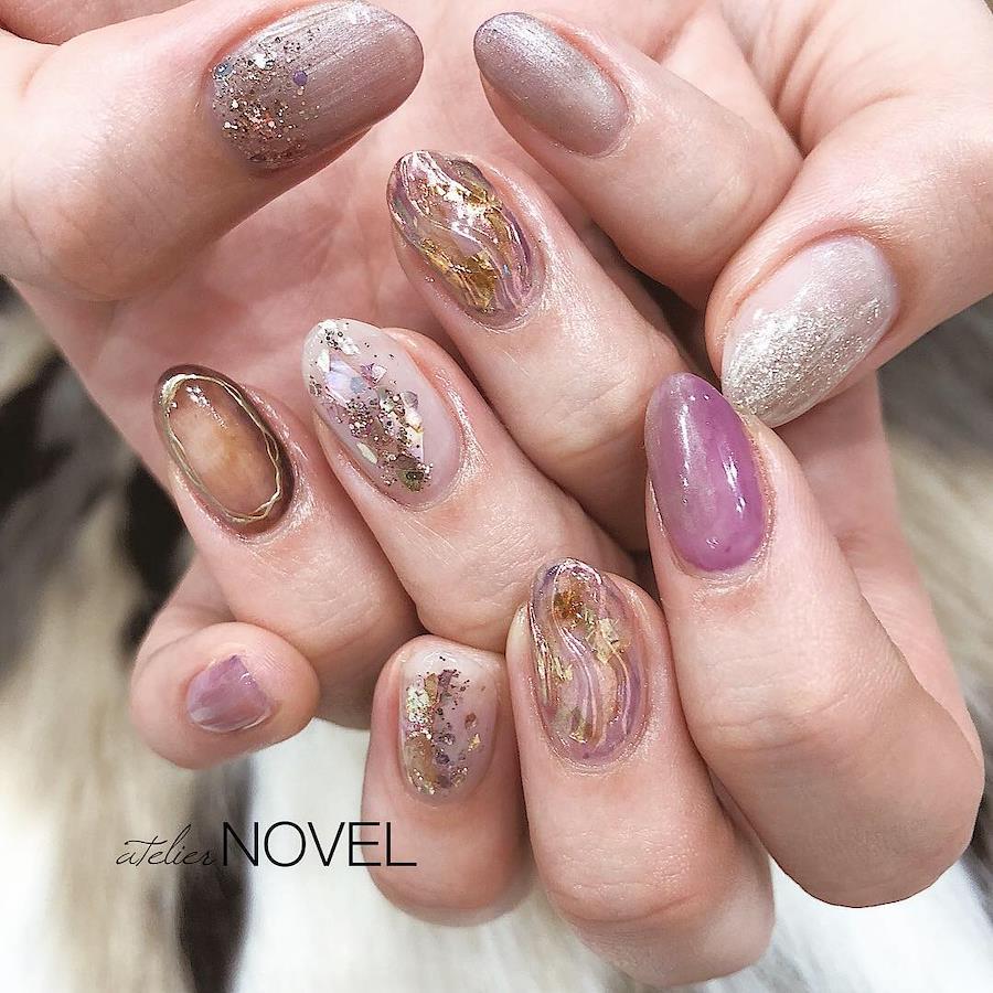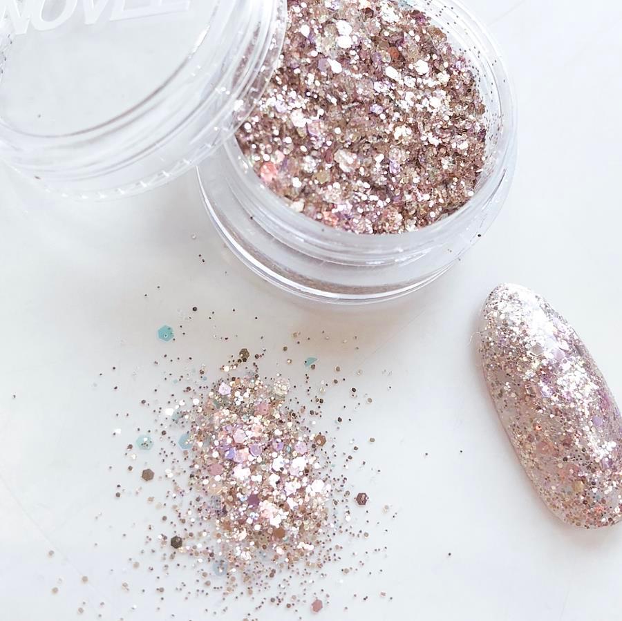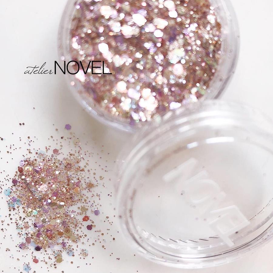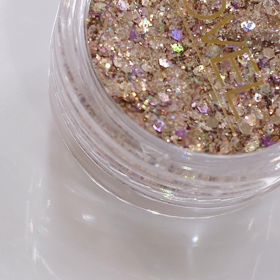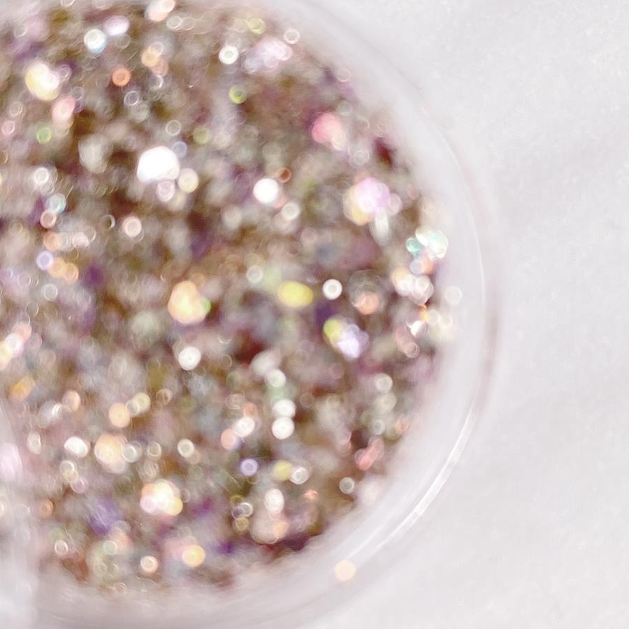 上品なシャンパンゴールド、優しいパープルとオーロラのホロが入ったグリッターです。様々なデザインでオールシーズンご活用頂けるロングセラー商品となっております。