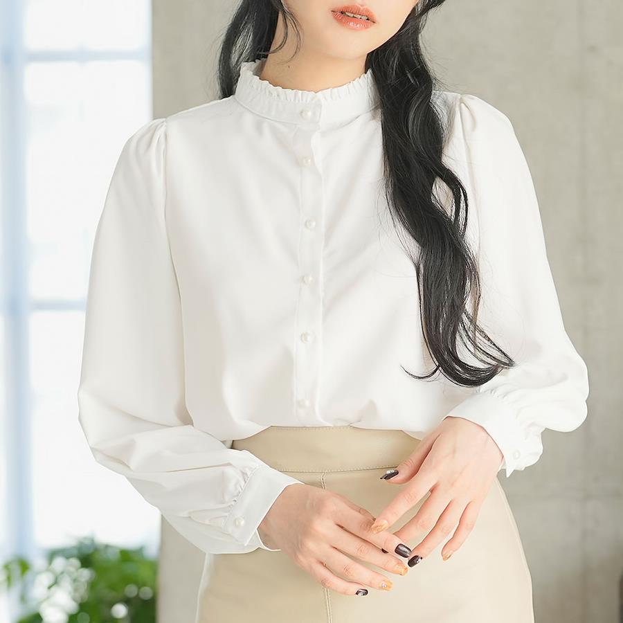 【デザイン】プチフリルをあしらったスタンドカラーが上品なデザイン。たっぷりとボリュームのある袖口も華奢見えポイント◎全体的にゆとりのあるデザインですが、程よい落ち感の素材で着膨れ感はゼロ。ボディ部分はあえてシンプルに、色々なアイテムに合わせられる便利アイテムです。