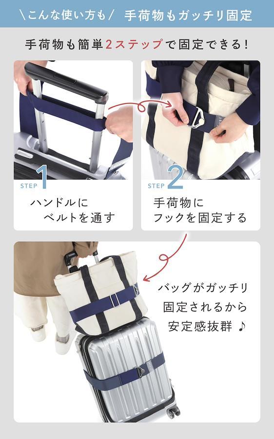 ?【5秒で装着完了】フックを掛けるだけですぐに装着できるから、外出先でもスマートに装着できます。 ?【荷物が固定できる】目印としての用途に加えて、荷物をスーツケースに固定することもできるから、片手が自由になります。 ?【伸縮素材でフィット感抜群】ベルトの一部に伸縮性のある素材を使用しているため、幅広いサイズに対応できます。 ?【選べる6色】シックな色から明るい色まで、幅広いカラーバリエーションから好みの色をお選びいただけます。 ?【耐久性◎】従来品に比べて厚手の生地で、バックルも金属製のため、空港での取り扱いでも壊れにくいです。