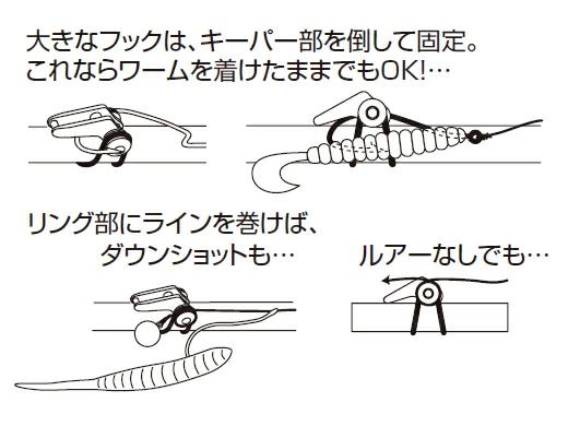■折りたたみ式~クリック音で絡み軽減!?~LHKMの折りたたみは、ボディ全体を支点とした、いわば簡易式。かわってEHKMは、フックキーパー部とリング部がセパレート構造という本格的な折りたたみ式。だから、起こし・折りたたみの動作がより軽快に行えます。使う時にClick! 折りたたむ時もClick! と、かわいい音のオマケ付き。このメリハリがあれば、折りたたみ忘れが原因で起こりがちだったライン絡みも激減する!?