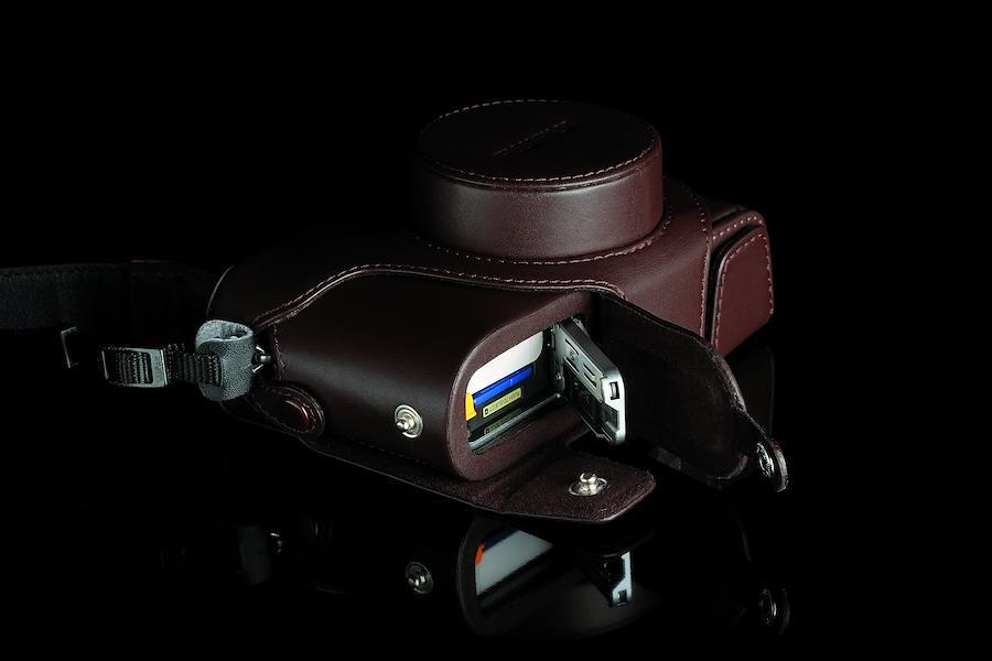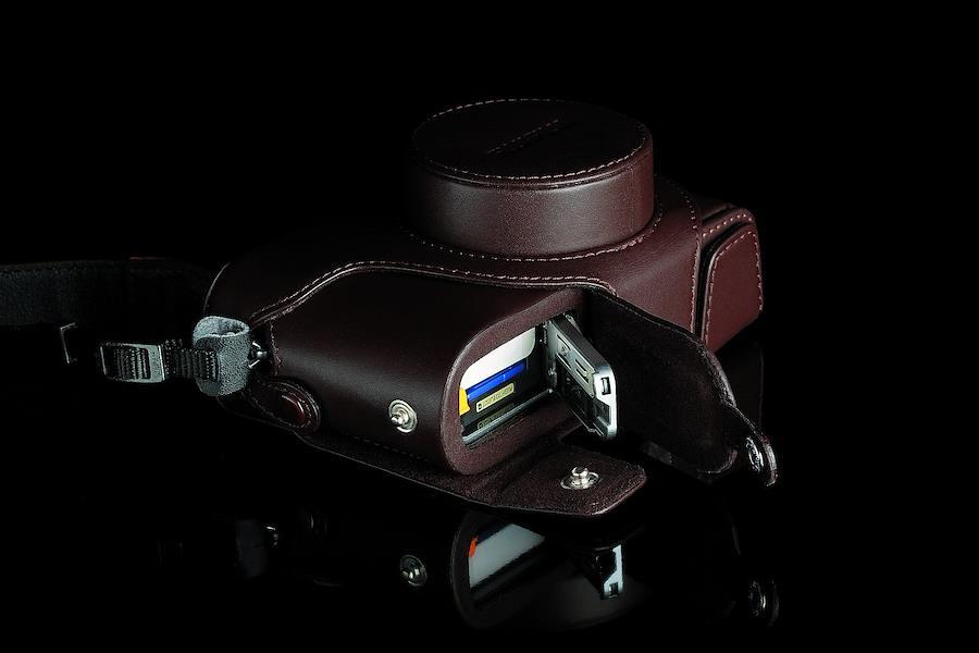 本体に装着したままメモリーカードやバッテリーの出し入れが可能。実用性にもこだわった高級本革製の速写ケース。