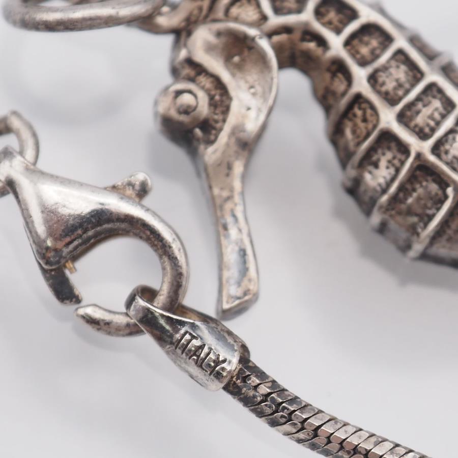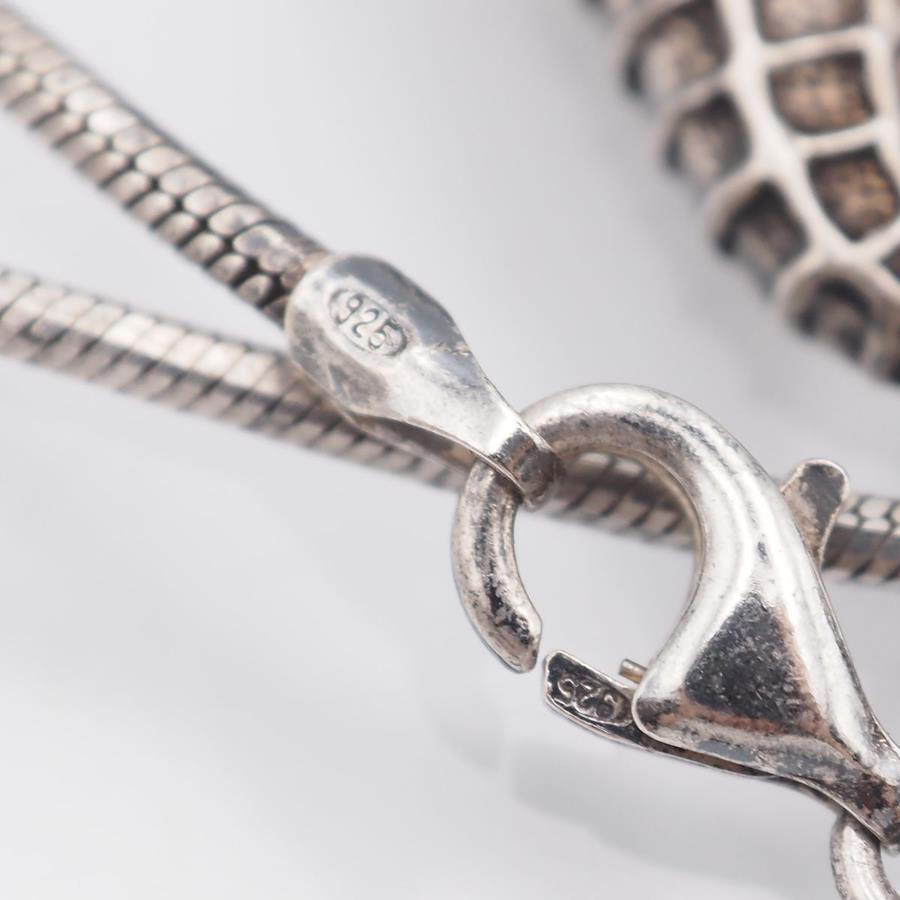 チャームは取り外し可能です。チェーンに925の刻印があります。チャームはおそらく銀製かと思いますが、刻印が無いため断言できません。画像をたくさん掲載しておりますのでそちらでご確認とご判断をお願いいたします。
