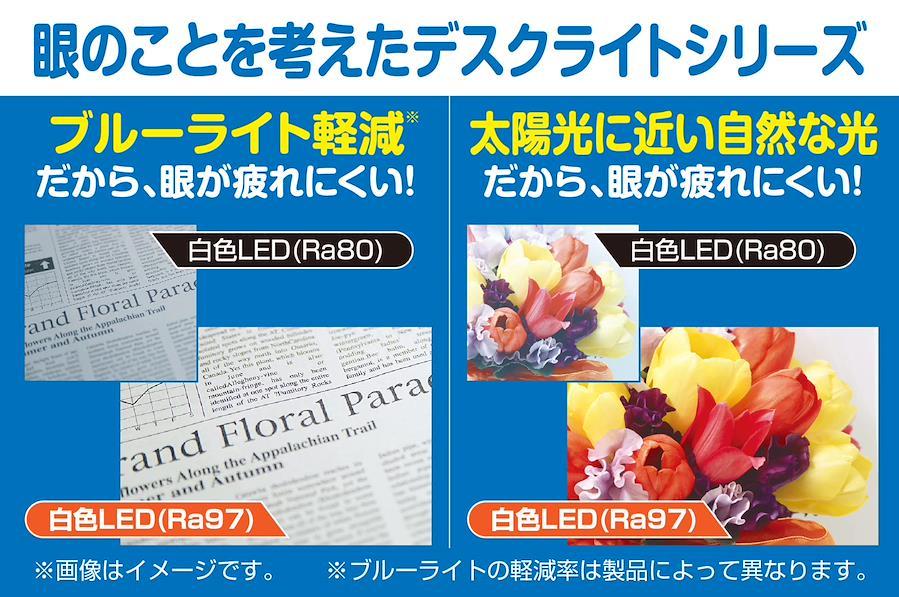 【眼のことを考えたデスクライト】高演色 (Ra97) LEDによりブルーライトを軽減 (※) し、太陽光に近い自然な光を実現。眼が疲れにくい※当社の旧製品 (平均演色評価数Ra80のLEDを使用) と比べ、ブルーライトを約35%軽減