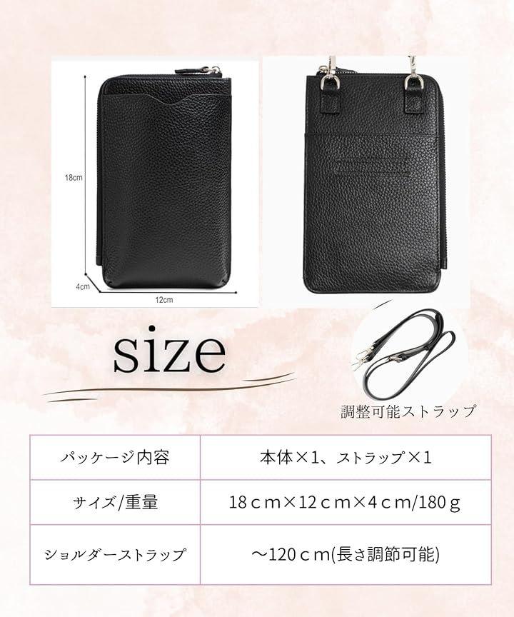 材質:牛レザー(本革) 、ポリエステル(内側) サイズ:約18x12x4cm ショルダーストラップ:約100~120cm(長さ調整可能)、重量:約180、*サイズは計測方法により2~3cmの誤差が生じる場合もございます。