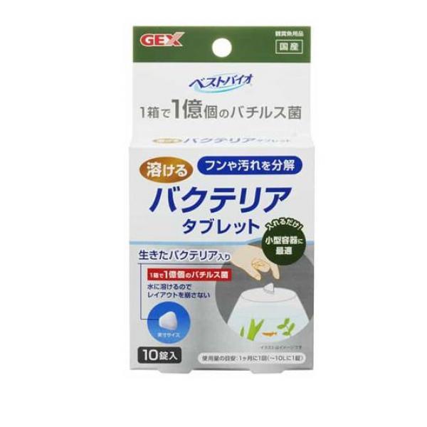 製品の特徴●フンや汚れを分解!小型容器に最適な溶けるバクテリアタブレット。●生きたバクテリア入り!1箱で1億個のバチルス菌。●バチルス属バクテリアを、独自製法により生きたまま休眠状態でタブレット化。入れるだけで有機物の汚れ(フンや残餌)を分解し水槽内をキレイに保ちます。●水に溶けるので、レイアウトを気にせず使用できます。●フィルターを使用できない小型容器に最適です。また、フィルターの補助としても使用できます。