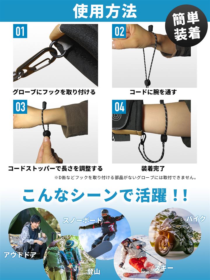 「スノボー経験者が企画」東北6県の雪山を拠点としていたスノーボード経験者が、皆さまの声を元に企画し作り上げたグローブ用のリーシュコードです。