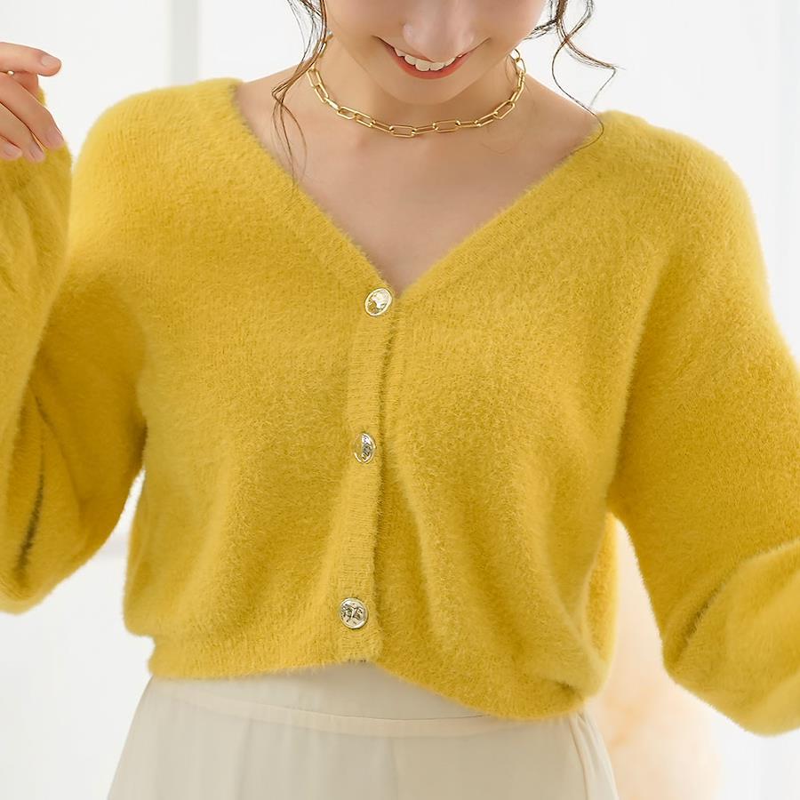 【デザイン】コンパクトな丈感が今年らしいアイテム。程よくあいたVネックは、1枚でトップスとして着ても中にインナーを着てもネックラインを綺麗に見せてくれます。ぽわっとした袖がガーリースタイルにぴったり◎やや落ち感があるので、着膨れ感なくすっきりと着ていただけます。