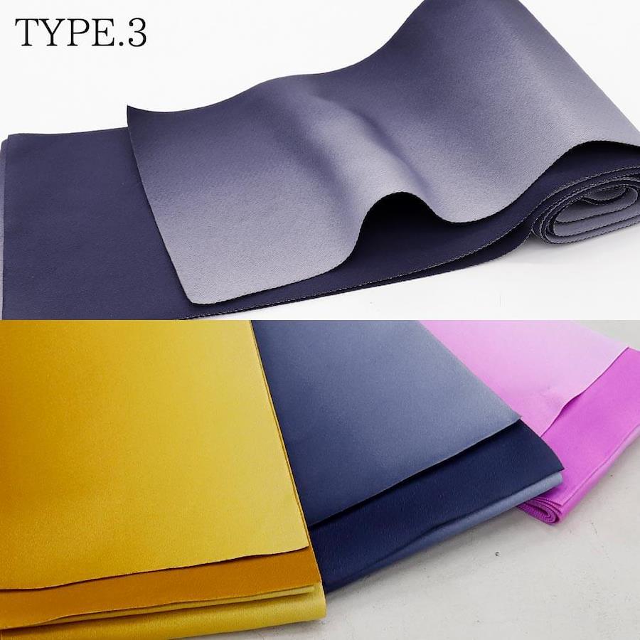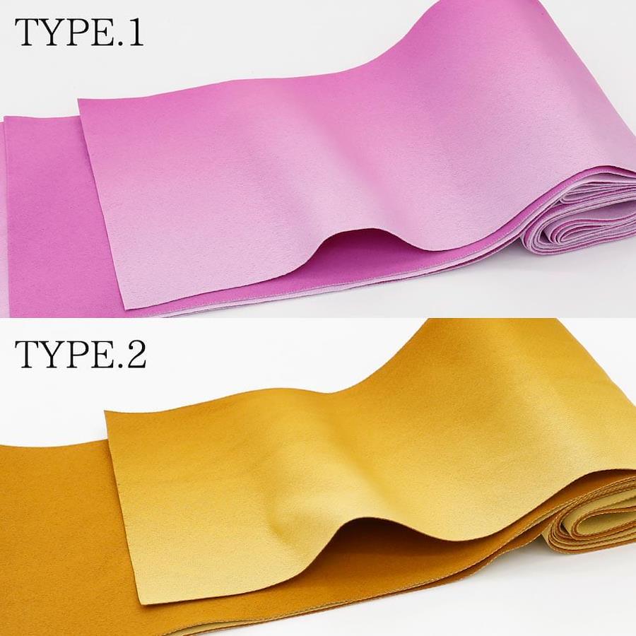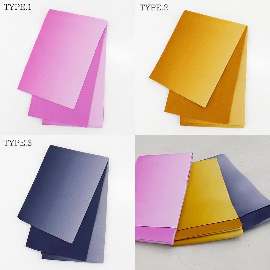 女性用のリバーシブル半幅帯で、片面ずつ異なる色のグラデーションが施されており、結ぶだけでセンス良く見えるのが嬉しいポイントです。