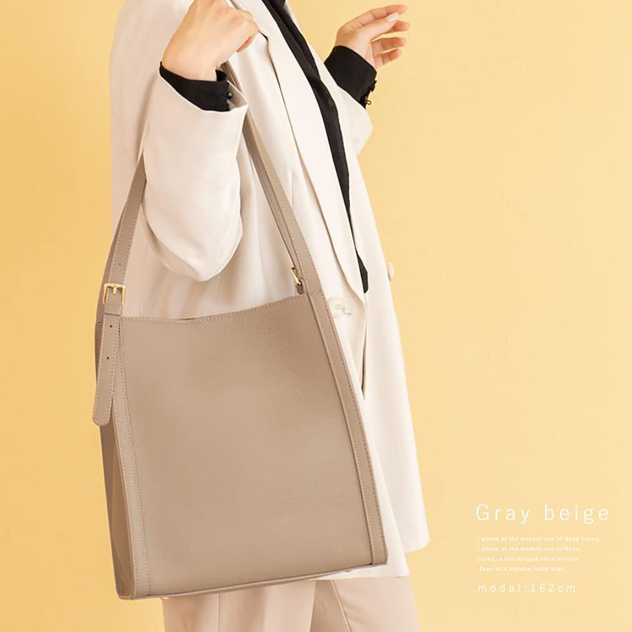 ショルダーバッグ レディース 通勤 b5 本革 大きめ 縦型 自立 通勤バッグ 軽量 大容量 スクエア 大人 レザーバッグ 肩掛け シュリンクレザー 仕事バッグ 通学 ビジネスバッグ ベルトハンドル トートバッグ Gratanteアシンメトリーなベルトハンドルが特徴的な縦型ショルダーバッグ。 上質なシュリンクレザーを使用し、スクエアフォルムが上品かつカジュアルな印象に。 超軽量で荷物を入れても気軽に持ち運べるので、通勤・通学バッグにぴったり。 ベルトハンドルは4段階で調節可能で、アウターの上からでもすっきりと肩掛け出来ます。 シンプルながらも遊び心のあるデザインで、さりげないおしゃれを楽しみたい方にオススメ。縦長の四角いフォルムで底鋲付き、しっかりと自立します。 背面には使い勝手の良いマグネット開閉ポケットが1つ。 内側には、小物整理にぴったりなオープンポケットが2つ。 もう片側にはファスナーポケットが1つあり、間はオープンポケットとして使用出来ます。●SIZE:高さ:約29cm / 幅:約26cm(上辺)約28cm(下辺) / マチ:約11cm ●ハンドル長さ:約60~70cm×幅:約1.5cm(取り外し不可能/調節可) ●ハンドル高さ:約27~33cm ●外ポケット:背面マグネット付きポケット1 ●内ポケット:オープンポケット3、ファスナー付きポケット2 ●バッグのみ重量:約511g ●素材:本牛革(トップレザー) ●バッグのメイン開閉口はマグネットになっております。