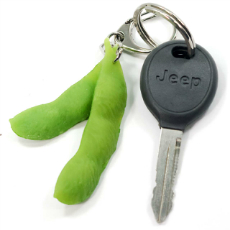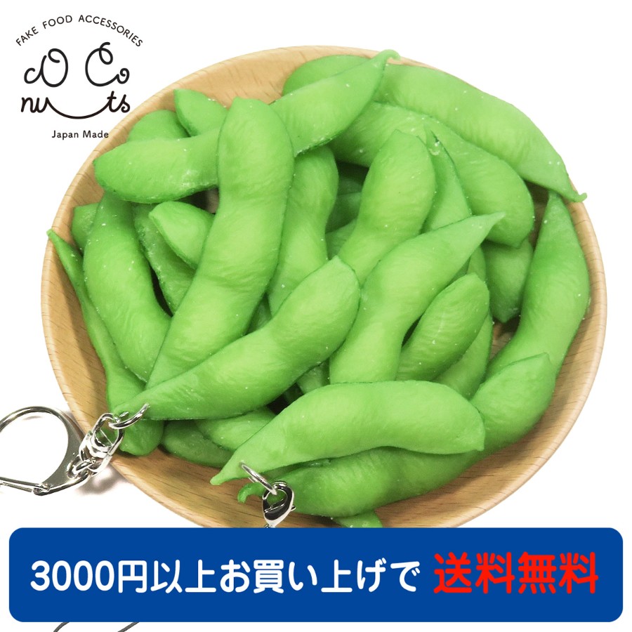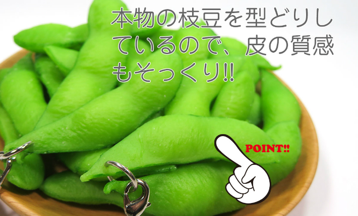 ビールのお供に枝豆のアクセサリーはいかがですか・・・って、見ているだけじゃおつまみになりませんね。どこから見ても本物そっくりな枝豆の食品サンプルです。3粒入りのさやと2粒入りのさやを2つペアでアクセサリーにしました。
