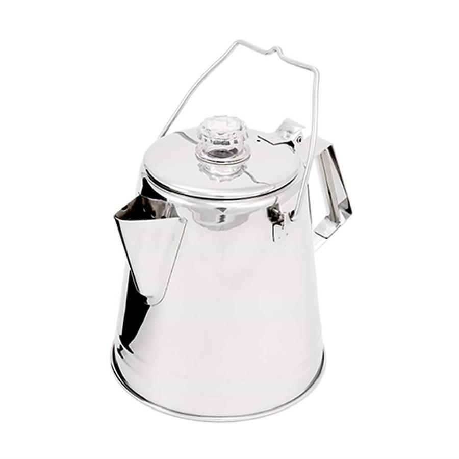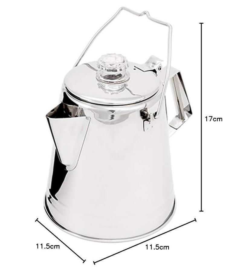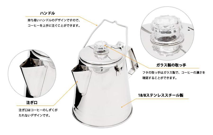 円錐形のクラシックなデザインの18/8ステンレススチール製パーコレーターです。家庭やアウトドアで美味しいコーヒーが手軽に味わえます。持ち易いハンドルのデザインですので、コーヒーを上手に注ぐことができます。注ぎ口はコーヒーのしずくがたれないデザインです。フタの取っ手はガラス製で、コーヒーの濃さが見えます。