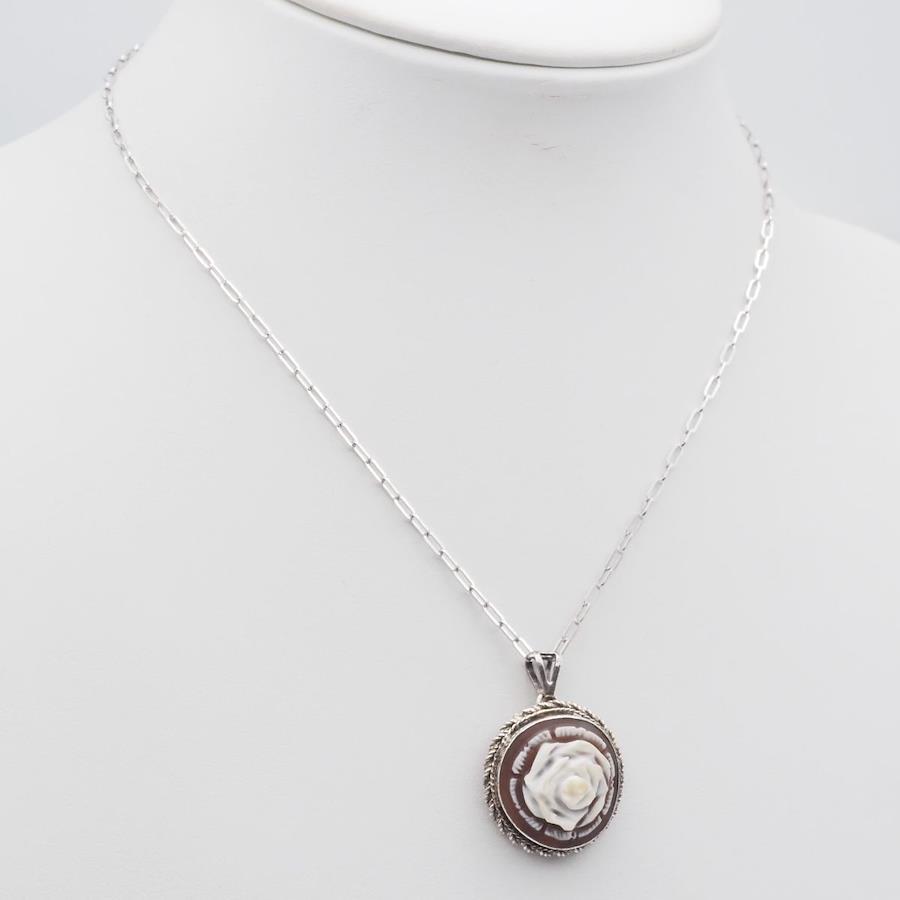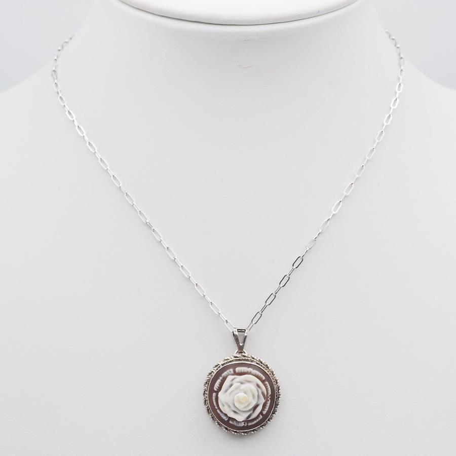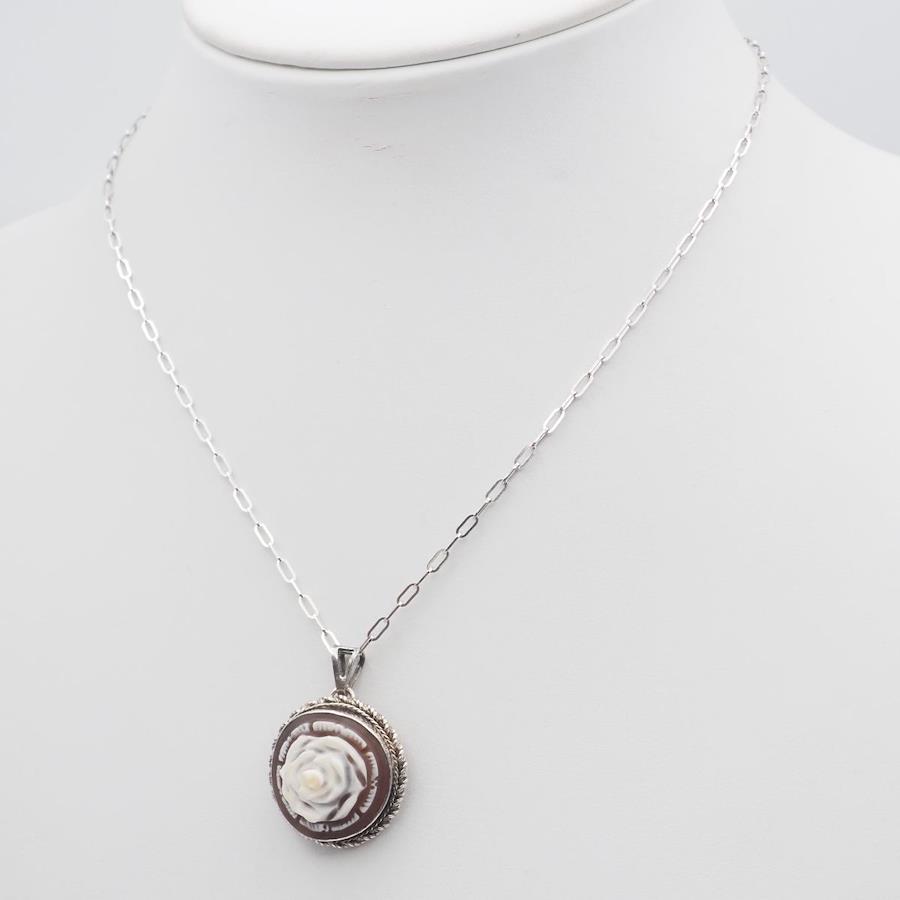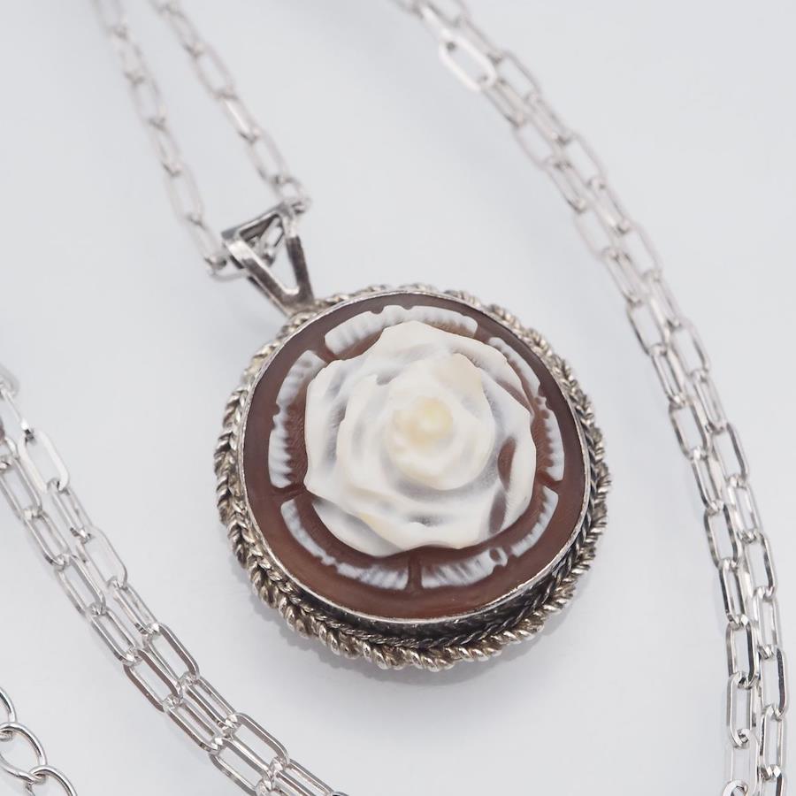 H923 シェルカメオ STERLING SILVER925刻印 ペンダント ネックレス 薔薇 バラ ローズ デザイン シルバー ヴィンテージ
