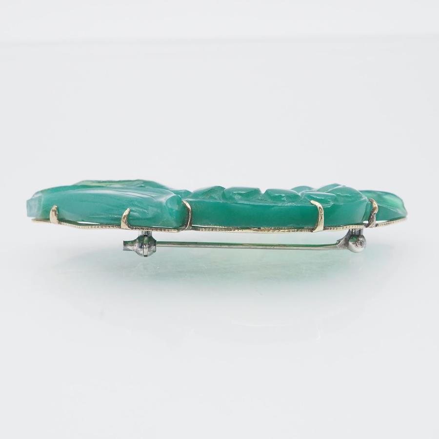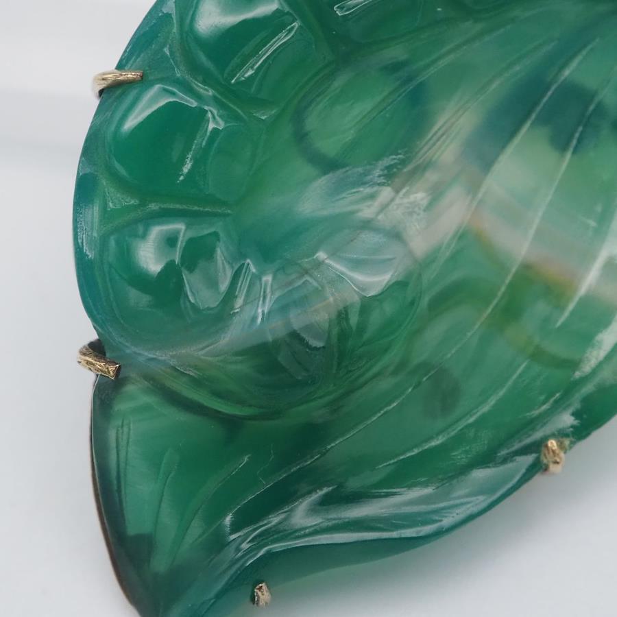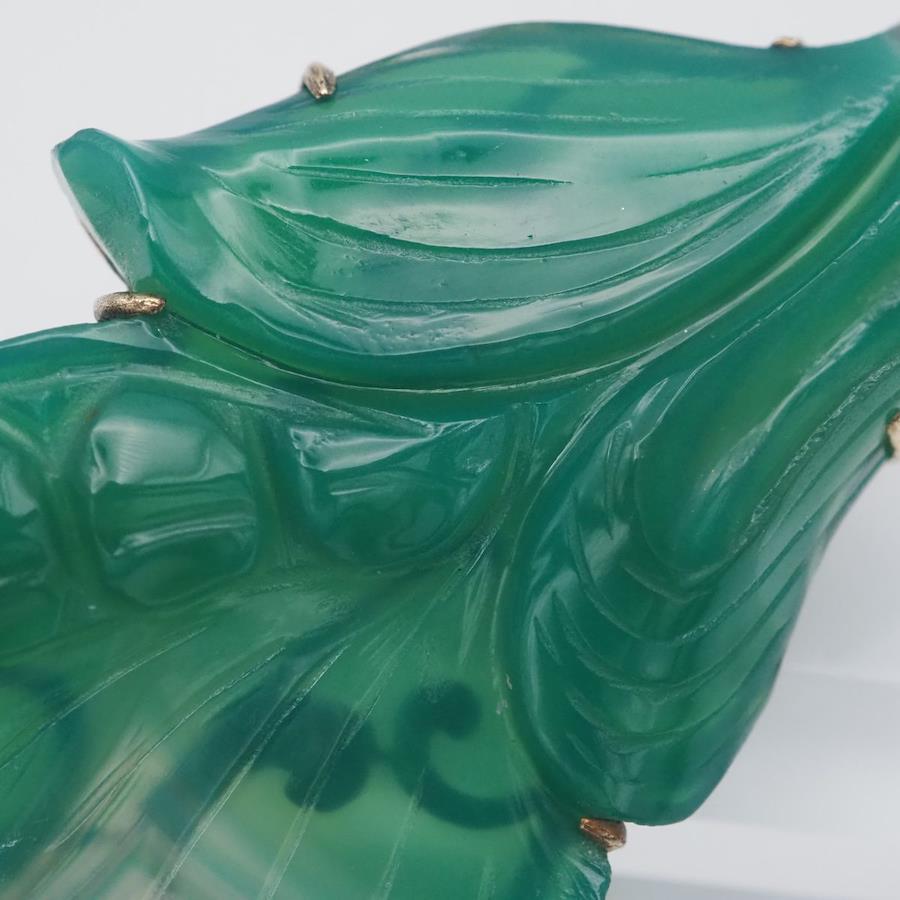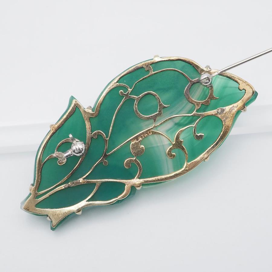 H957 グリーンアゲート 緑瑪瑙 メノウ PLATED刻印 ブローチ 花彫刻 裏細工 デザイン シルバー