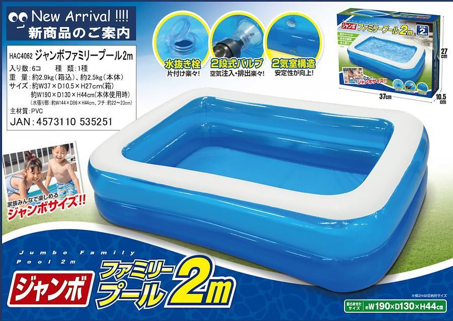 サイズ:約W190×D130×H44cm主材質:PVCジャンボファミリープール2m家族みんなで楽しめるジャンボサイズ!水張り部:約W144×D86×H44cm、フチ約22~23cm【免責事項】メーカーによる商品リニューアルに伴いパッケージが変更が行われた場合、新パッケージでお届け致します事ご了承願います。
