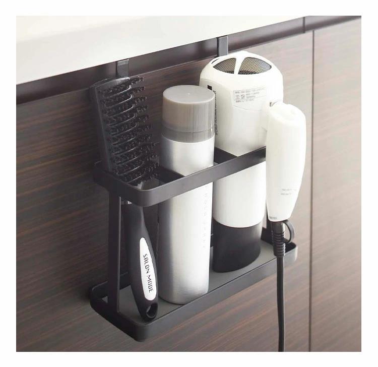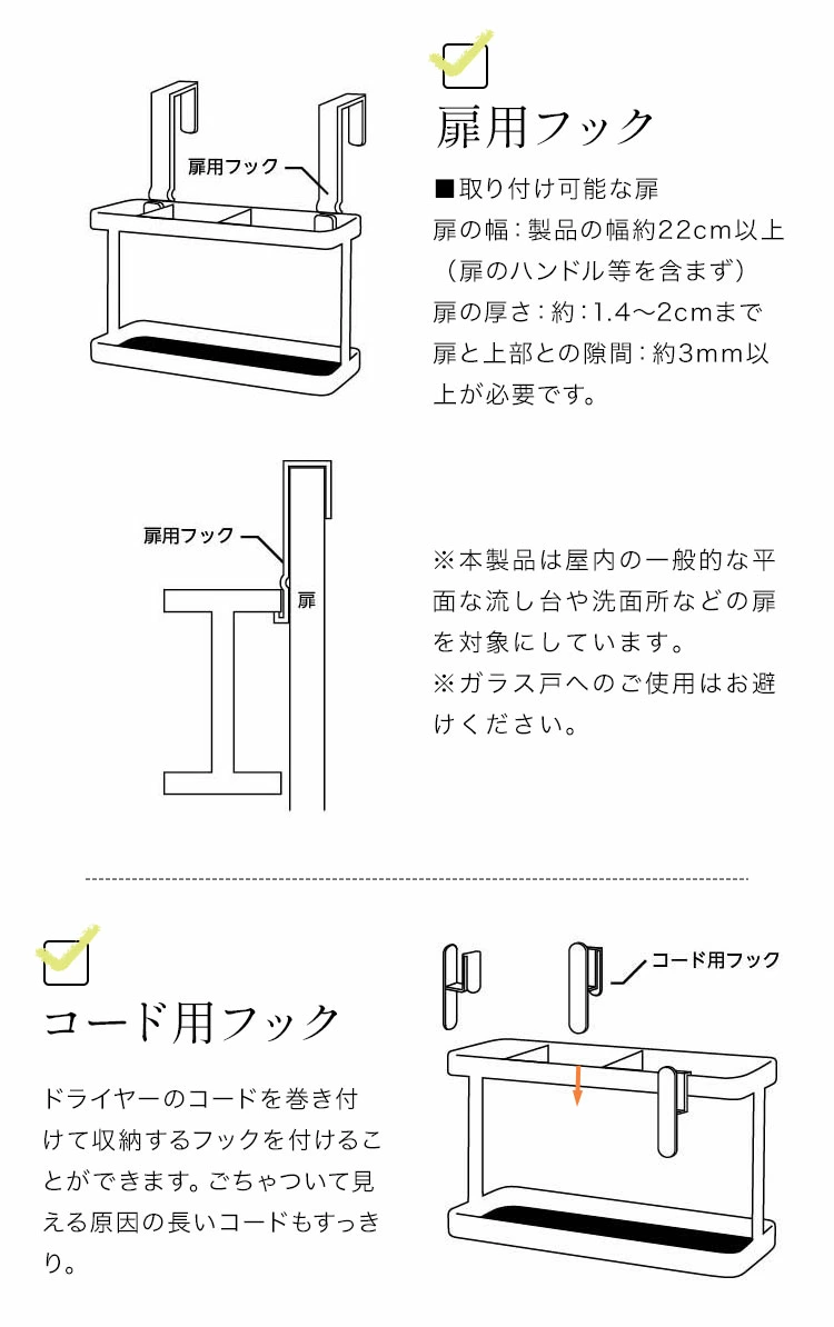 ドライヤーやヘアーアイロンをすっきり同時収納!ヘアースプレーやブラシなどのスタイリンング用品も収納できます。すぐ取り出せるので使いやすく、洗面所周りがすっきり片付きます。洗面所の扉にも取り付け可能だから空間を有効活用することも◎コードは付属のフックに巻き付けて収納でき、ブラシ付きドライヤーも収納可能です。