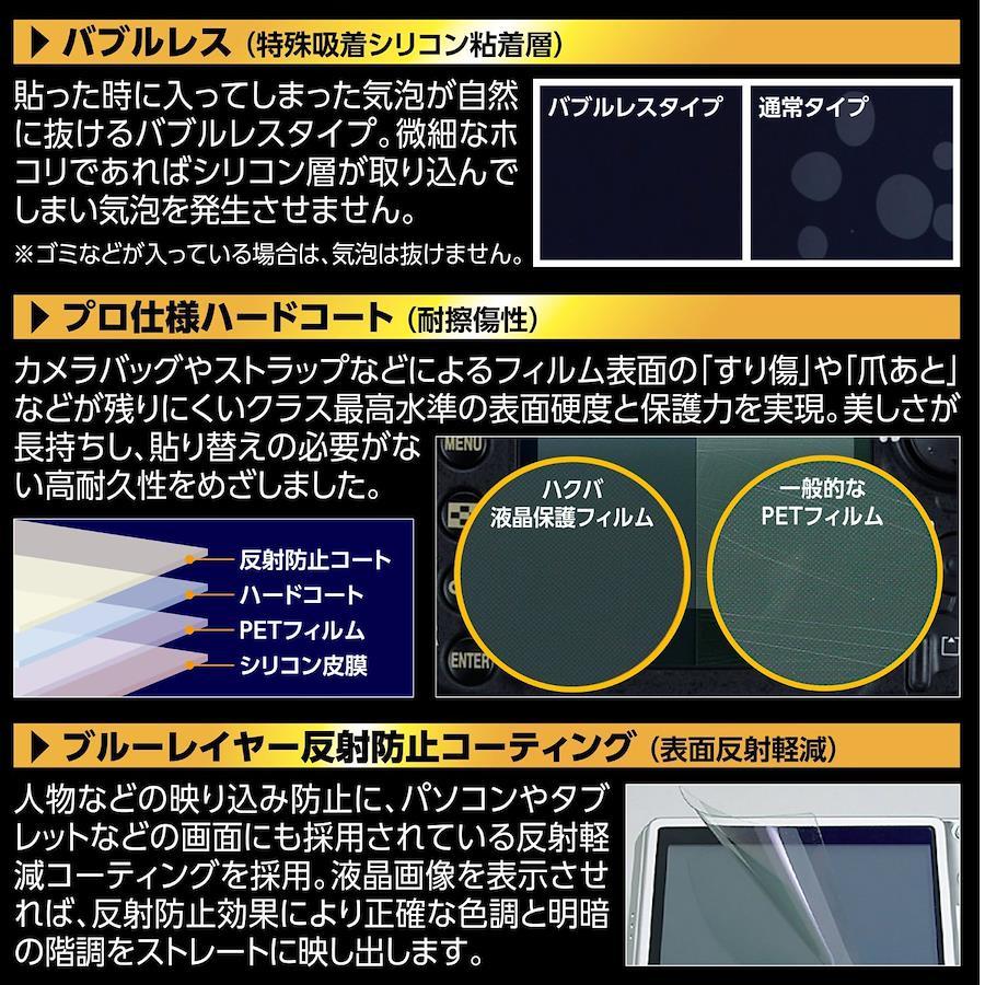 3営業日以内に発送≪新品未開封品≫:最高水準の表面硬度と貼りやすさを誇るバブルレスタイプの液晶保護フィルム。ブルーレイヤー反射防止(AR)コーティングにより視認性の高いクリアな画面を保ちます。帯電防止処理済み。・人物などの映り込み防止に、パソコンやタブレットなどの画面にも採用されている反射防止コーティングを採用。高い反射防止効果により正確な色調と明暗の階調をストレートに映し出します。・貼った時に入ってしまった気泡が自然に消えるバブルレスタイプ。微細なホコリであればシリコン粘着層が取り込み気泡を発生させません。※ゴミなどが入っている場合は、気泡は抜けません。・フィルム表面の「すり傷」や「爪あと」などが残りにくいクラス最高水準の表面硬度(3H)と保護力を実現。美しさが長持ちし、貼り替えの必要がない高耐久性をめざしました。※人の爪の硬さは2H程度です。・帯電防止性により液晶画面にホコリやチリを寄せ付けません。撥油性フッ素系素材を採用しており、指紋汚れをはじくため、簡単に拭き取ることができます。・シリコン粘着層の自己吸着性により、フィルムを画面に置くだけで自然に貼りつくため貼り付けが簡単です。また、貼り付け