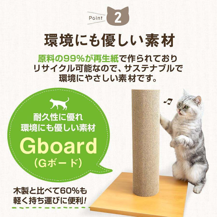 環境に優しく独創的な再生紙GBoardを使用したポール型の猫用つめとぎです。屑が出にくく、お手入れがラク!木製と比べ60%も軽く、持ち運びに便利です。硬めの爪とぎを粘り強くバリバリするのが好きな子、立って爪とぎをする子用。お掃除が楽な方がいい!という飼い主さんにも、ゴミが出にくいのでおすすめです。替え爪とぎを別売りでご用意。交換も簡単です。
