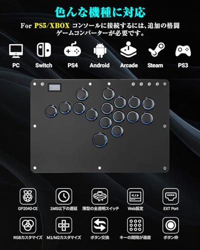 Leverless Controller, Leverless Acoustic Con, Supports Knees, No Delay, R16 for Premium Games, For PC Switch, PS4 PS3, RGB LED Light, DIY Hot Swap, Top Plate Customization, Wide Top, Continuous Shooting Function, Fighting Game Controller, Japanese Instruction Manual Included (R16, Black) Leverless Akecon R16 Black: The layout of the buttons has changed compared to the T16-C. Uncommon 2 buttons are moved to the left pinky finger, so if you are used to using your pinky finger, you can customize the M2 button that can be used to use your pinky finger. The color scheme of the main unit is beautiful, and the added button frame gives it a firm feel, yet is easy to use. No button snagging or falling off, just the right size for easy carrying Equipped with a wide tabletop, ultra-thin, portable, and Kailh high-transparent, low-profile key switch, the LED light is quite bright. It eliminates the false explosion of jumping with command input, allowing you to operate it faster and more precise than traditional arcade sticks, making it easier for fighting games. Allows firmware updates to systems such as pico GP2040-CE, break fix etc. Compatible models: Windows 10 or later / Steam Deck/PS3/PS4/Switch/Raspberry Pi (Lakka, RetroPie, Recalbox, Batocera)/MiSTer/Android, Linux, iPad OS, macOS. (Note for Connecting to PS4/PS5) Please refer to the official website or manual for connecting to the For PS4/PS5, so please read the Japanese instruction manual or link to the official website (haute42.com/supports/). This product is a PS5 unit that supports PS4 game, but if you want to play PS5 game, you need a converter specifically for the Akecon, so you will need to purchase it separately. The M1 and M2 have the same function specifications, and the 192.168.7.1 web plauzer can change the key function. For durability, the hot swap makes it easy to change key switches and key caps. If the key cap is removed or worn naturally, please contact us and we will arrange a replacement for your key switch or key cap Overwhelming Features: There are plenty of features that other lever-less. Equipped with continuous firing function. Change the Analog Stick Includes SOCD selection function. Keyboard operation can be assigned. Can store up to 4 profiles and change with one button during use. Light up LED and pattern selectable. Button replacement EXT port and M1/M2 custom key Precise settings when pressing the direction key at the same time. It also has a button mapping function and is excellent in terms of functionality. For example, you can change or turn off the SOCD cleaner or recognize it as a keyboard instead of a game controller, the GP2040-CE can do it (Interchangeable Buttons & RGB Customizable) Made of transparent acrylic material with RGB lighting effect, our shop can provide you with a template and customization method for customizing the tabletop, so you can DIY your own illustrations. There are 4 types of luminescent patterns. You can generally set the color scheme to your liking, and you can also turn it to another color when you press the button. It is hot-swappable, so you can easily change the switch or key cap for customization, so you don't have to worry about wearing the switch, and the press pressure is about 1.2 oz (35 g), so your fingers won't get tired. You can experience a variety of key types Connections, Settings, and Package Contents: 1. Connection: When inserting the designated button and plug it into the USB to connect with compatible devices. [Settings] The web configuration means you can connect this product to a computer to assign buttons and turn off various settings. Press the start button to connect with your PC. The LCD screen displays web configuration mode, so open the web browser and input "192.168.7.1" in the address. When the connection is successful, it will turn on the home screen and can be set up in a variety of settings. 2. Package Contents: Product Size: 11.7 x 7.7 x 0.4 inches (296 x 196 x 10 mm), Weight: 27.8 oz (780 g). The size is easy to use for kneeling play. R16 Fighting Game Controller (16 Buttons) x 1, USB Cable x 1, Switch Puller x 1, Anti-Slip Pad x 6, Japanese Instruction Manual x 1