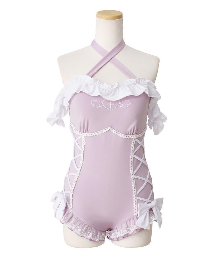 オフショルダハート十字架レースアップ水着キュートでゴシックな雰囲気を持つ個性派デザインの水着が登場♪胸元には天使の羽とハート、クロスがデザインされた刺繍が施されており、甘さの中にも少しゴシック風な魅力が漂います。肩にはオフショルダー風のフリルがついており、首元のクロスストラップがデコルテを美しく見せてくれます。サイドにはコルセット風のレースアップデザインがあり、ウエストラインをすっきりと見せながら、細部までこだわったディテールが目を引きます。裾には配色のリボンと十字架柄のレースをあしらい、ゴシック風と上品さをプラス。