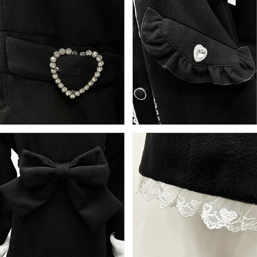 銀縁のくるみボタンがかわいく、襟にはハートバックルリボン、後ろにも大きめリボンと