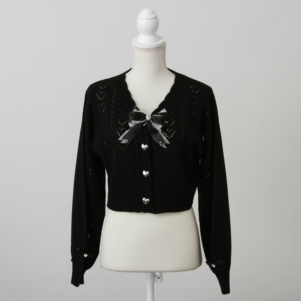 ときめくハート編地のかわいすぎるカーディガンが登場♪【デザイン】かわいいハートの編地の透かしカーディガンです♪ボリューム感のあるサイズ感でショートの丈感がスタイルをよく見せてくれます。カラーもかわいいカラーを沢山ご用意したので参戦服としても活躍してくれます♪前立てにはシルバーハートの立体ハートボタンとキラキラビジューのかわいいリボンがポイント♪コーデのワンポイントにもなるオススメのアイテムです。【素材】透かし編みのニットです。前のボタンで着脱可能です。前立てリボンは取り外しが可能です。【コーディネート】色々なコーデに合わせて着用できる万能カーディガンです。肌寒い季節や室内で羽織りたいときなどに活躍してくれます。ボリューム感があるのでどんなコーデにも羽織って頂けます♪《透け感》ややあり 《生地の厚さ》普通 《裏地》なし 《伸縮性》なし《生産国》中国