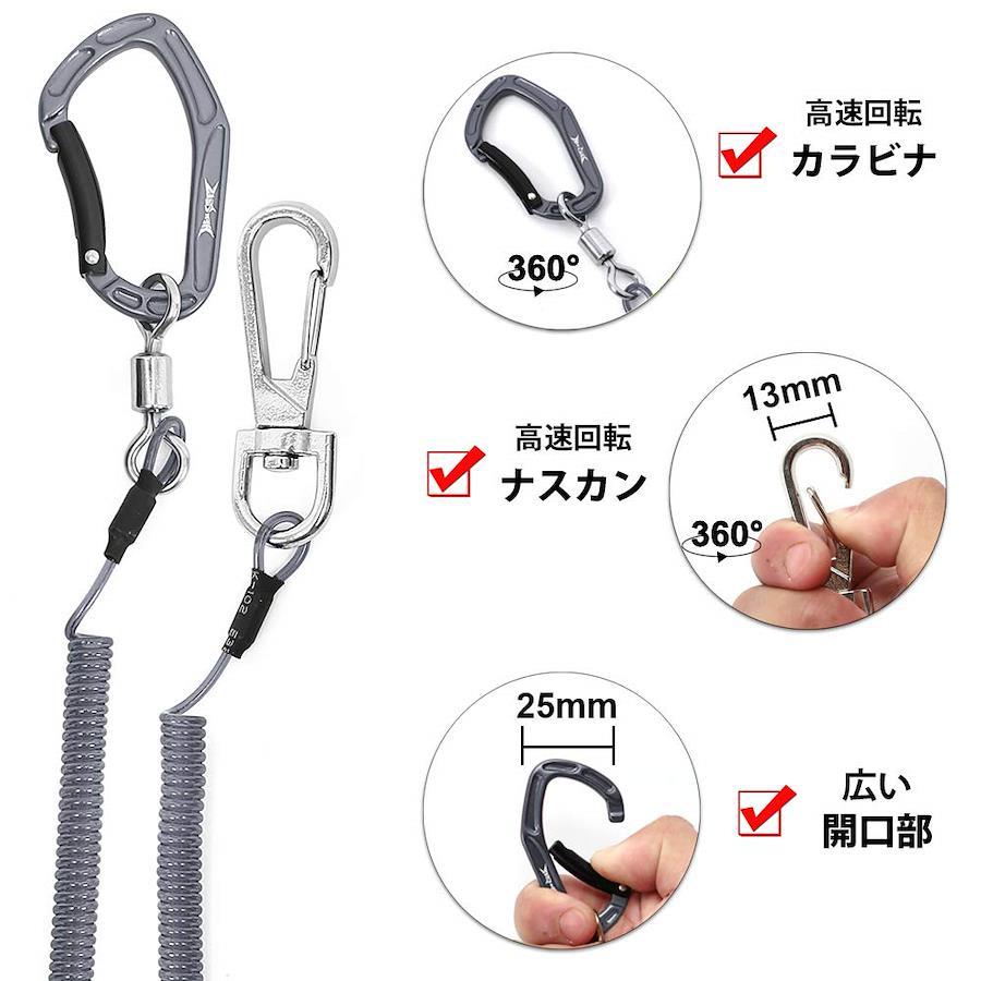 【商品仕様】ワイヤーコード材質:カラビナはアルミ製,カールコードはステンレスワイヤー内蔵+表PVC素材+TPUコーティングされ;ロッドベルト材質:亜鉛合金カラビナ+マジックテープ、100%収縮タイプ。いろんなものの固定が簡単にできて何度でも使えて便利に利用できてます。太い物の固定には数本組み合わせれば調整ができます。?【調整可能】 調節可能なベルクロを巻くだけで、釣竿やフィッシングロッド、カヤックのパドルをしっかりと結びつけることができます。 2個入りで、シングルリングとダブルリングも良い。 フィッシングロッドやパドルのグリップなどの使用直径は1.8-10㎝をお勧めします。?【高品質】 100%ナイロンの物固定ベルトは、裏粘着剤不使用の裁縫タイプで、耐熱、防水、防汚性能が優れ、丈夫で取り付け、取り外しも簡単です。 バックル付きなので、締め付け強度も自由に調節でき、しっかりと縛れます。 高い耐久性と持久性、傷をつけたくない物などに、ご利用されております。?【多機能】 このマジックバンドは多用途で、釣り竿を束ねたり、リュックに魚籠をジョインとしたりとちょっとしたところで活躍します。