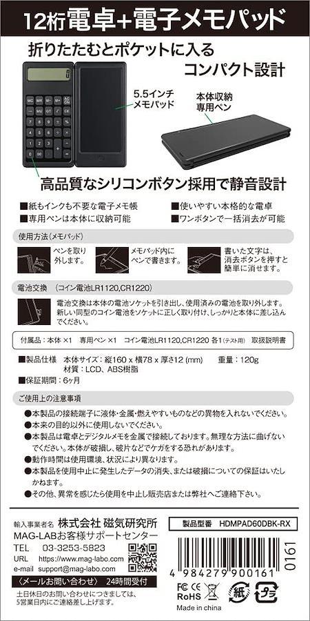 【商品詳細】■型番 HDMPAD60DBK-RX■JANコード 4984279900161■材質 LCD, ABS樹脂■電池 コイン電池LR1120(電卓), CR220(メモパッド)■重量 約120g■外形寸法 W78×H160×D12mm■備考・紙もインクも不要でペーパレスで地球に優しい電子メモ帳・繰り返し書ける・電池交換可能・5.5インチLCD液晶画面