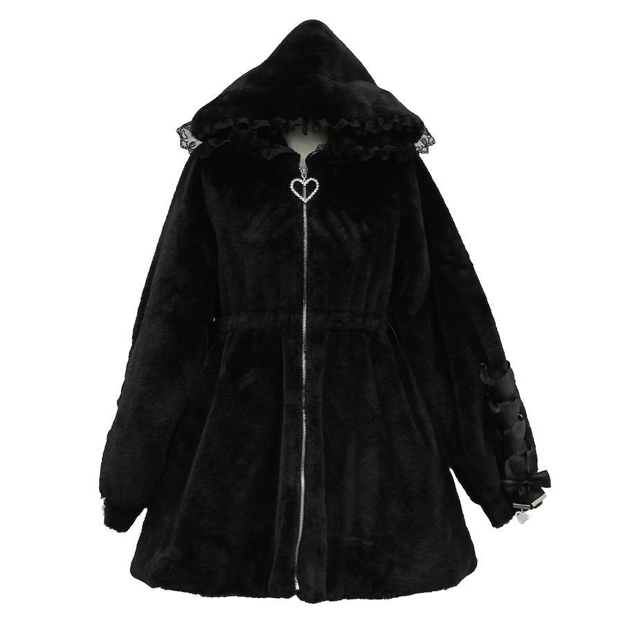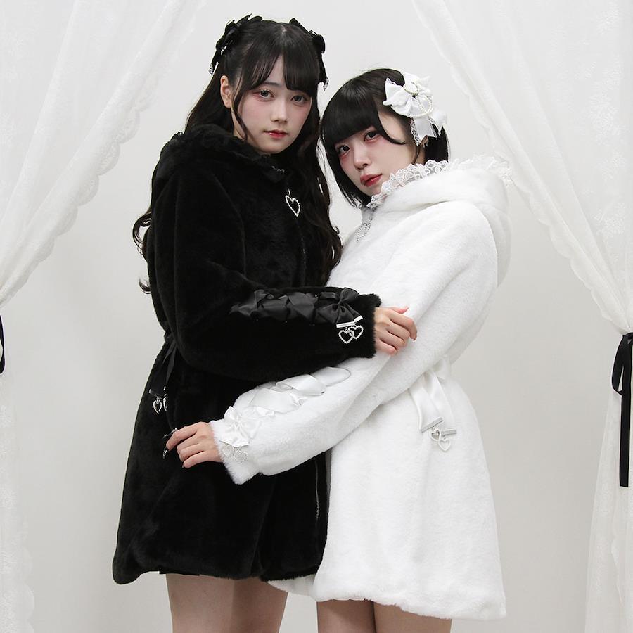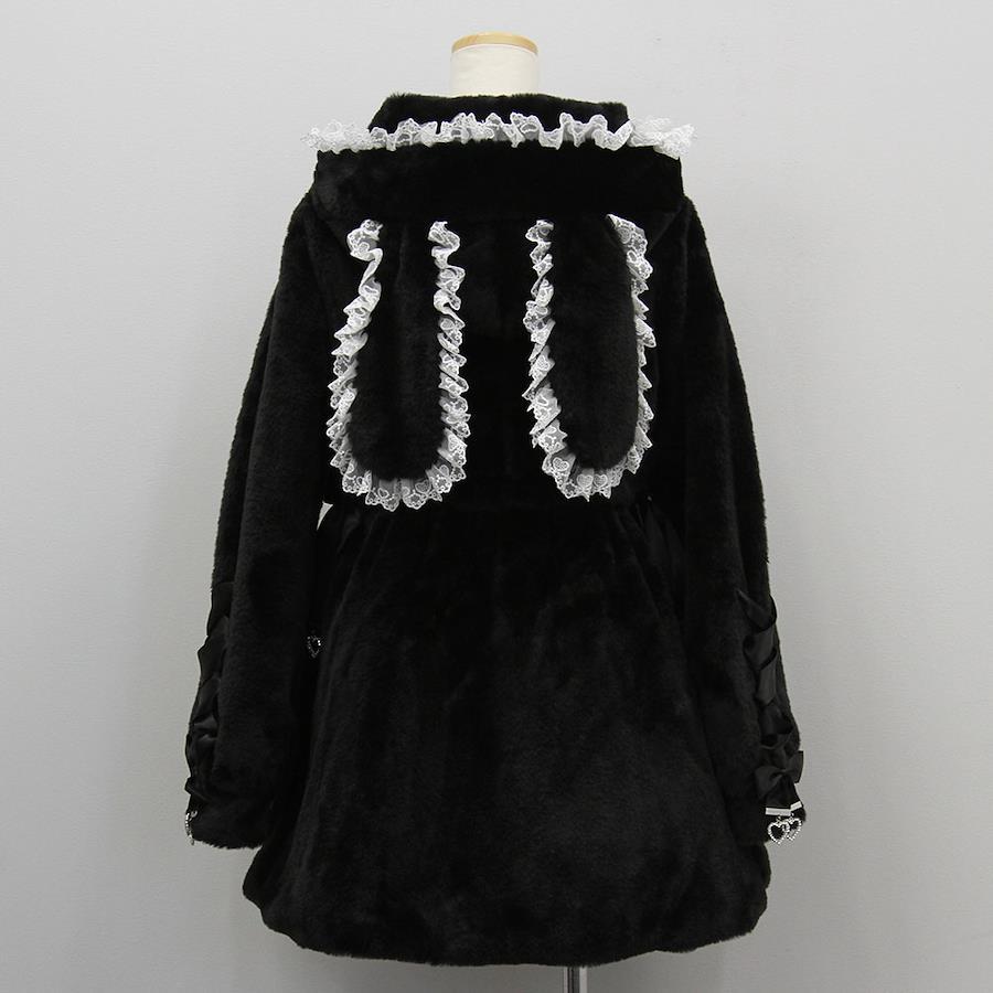 かわいいレースたっぷりのうさみみ付きフードデザインから選べるファーコートです。