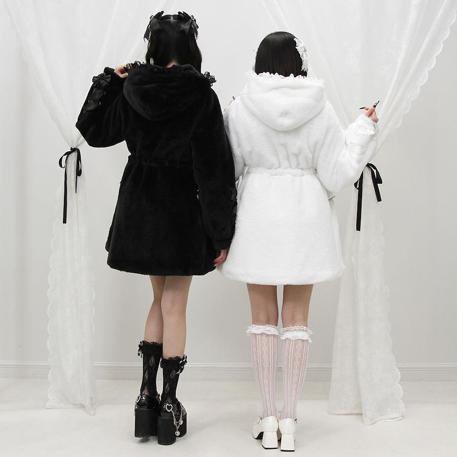 かわいいレースたっぷりのうさみみ付きフードデザインから選べるファーコートです。