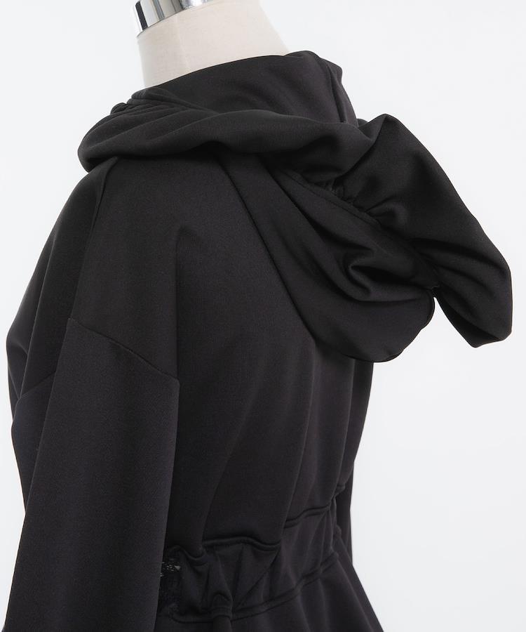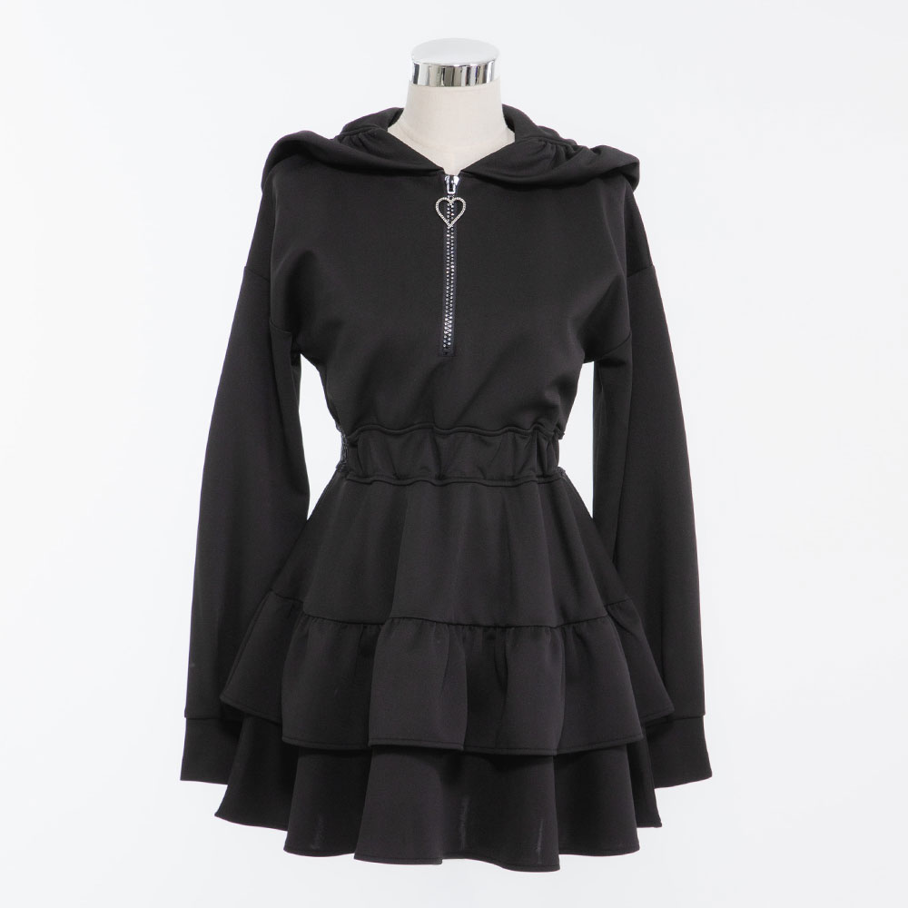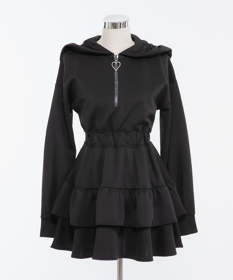 ◆Designフェミニンで華やかなフリルやティアードデザインが加わったワンピースです。フードが付いているため、カジュアル感もあり可愛さも増し増しです。ウエストでキュっと絞れてスタイルアップ。フロントジップのキラキラデザインまで拘りました。脇はレースで肌魅せデザイン。軽やかなポンチ素材で着心地も◎