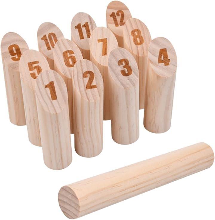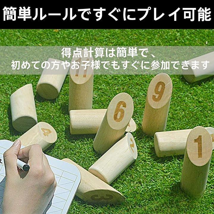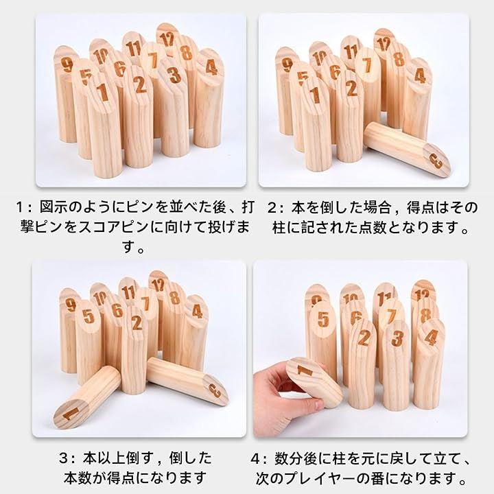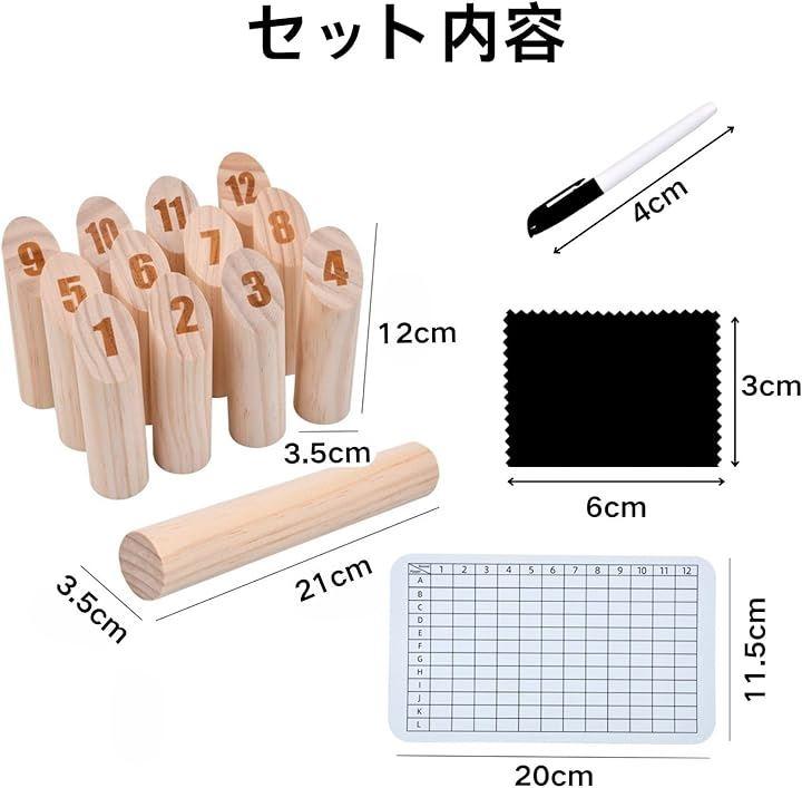 「商品仕様」セット内容:棒、スキットル12本、スコアボード 素材:木材 サイズ:画像を参照してください 「注意事項」周囲に十分な空間を確保し、安全に配慮して遊戯してください。
