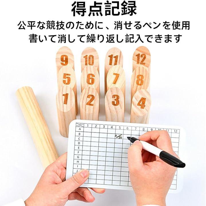 木製の本格セット 棒、スキットル12本、スコアボードがセットになった本格仕様。