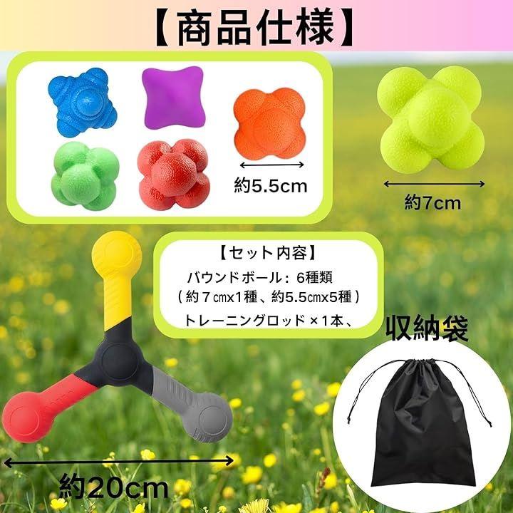 「セット内容」バウンドボール:6種類(7cmx1種、5.5cmx5種)、トレーニングロッドx1本、収納袋「商品仕様」バウンドボール:重量約55g/95g、TPR素材、トレーニングロッド:重量約75.3g、ポリウレタン素材*対象年齢12歳以上