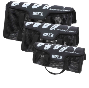 前面・背面・底面の三面がメッシュ素材なので使用後にルアーを入れたまま丸洗いできるPVC製のルアーメッシュバッグです。 3サイズ展開なのでショート・スロージグからロングジグやビッグプラグにも対応します。蓋の上部にはターゲットであるGT、マグロ、カンパチ、ヒラマサのイラストをデザインしました。