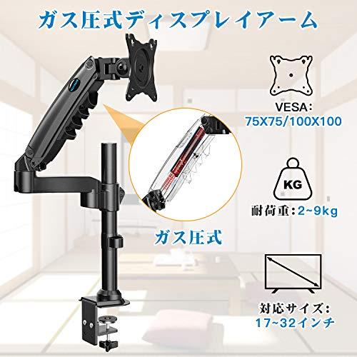 【商品仕様】17インチから32インチまでの液晶ディスプレイに対応できるモニターアームです。75*75mm/100*100mm のVESA規格に対応しています、耐荷重は2~9KGです。