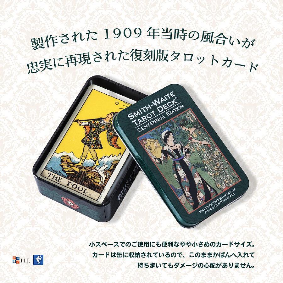 タロットカードの基本的な意味、占い方等を記載した日本語小冊子(商品専用の解説書ではありません) メーカーオリジナルの英文解説書 販売元:株式会社クロノスゲート/I.I.J メーカー:U.S. Games Systems, Inc. カードサイズ:57×95mm(小さめサイズの缶入りです。) 枚数:80枚