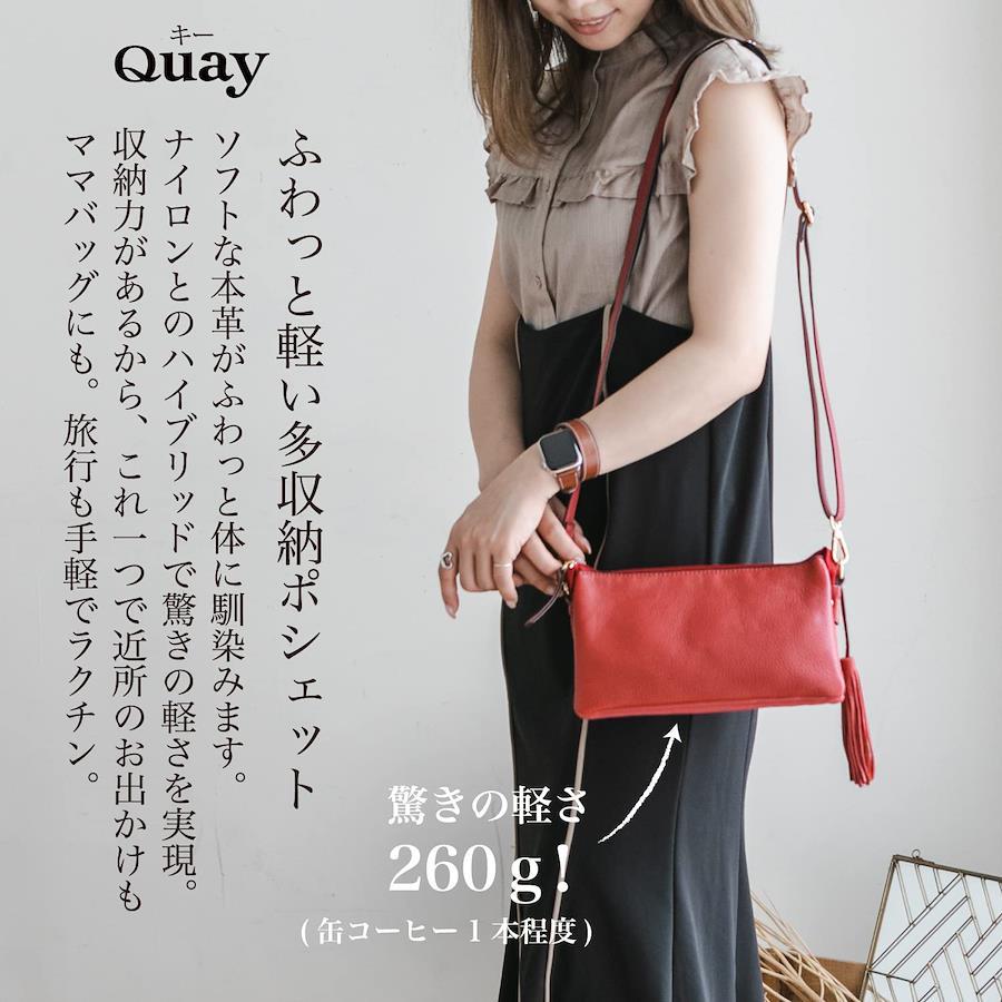 クロージャータイプ バックル ブランド QUAY(キー)人気 お財布ショルダー。本革で通勤、通学にもぴったり。ウォレットポーチとして斜めがけも楽々。財布代わりで使いやすい。仕切りたくさんで使いやすい。母子手帳やパスポートも入ります。大容量のお財布ポシェット。2wayで使用可能。チャームとしてタッセルつき。牛革(レオパード柄は牛床革)を使用したショルダーバッグ。260gと軽量だから持ち歩きも楽々! クラッチづかいもおすすめ。三層式でカードポケットもついているので旅行の時のお財布ショルダーとしても使えます。ソフト牛革を使用し柔らかく使いやすい手触りです。 一般的な長財布も入るサイズです。大切な方へのギフトにもオススメです。以下のシーンでのお祝いによく選ばれています! 誕生日、敬老の日、母の日、バレンタインデー、ホワイトデー、クリスマス、結婚記念日・・・ 奥さんへのプレゼントや母の日のプレゼントによく選ばれています。